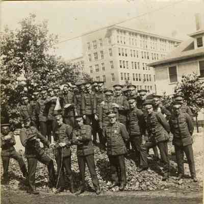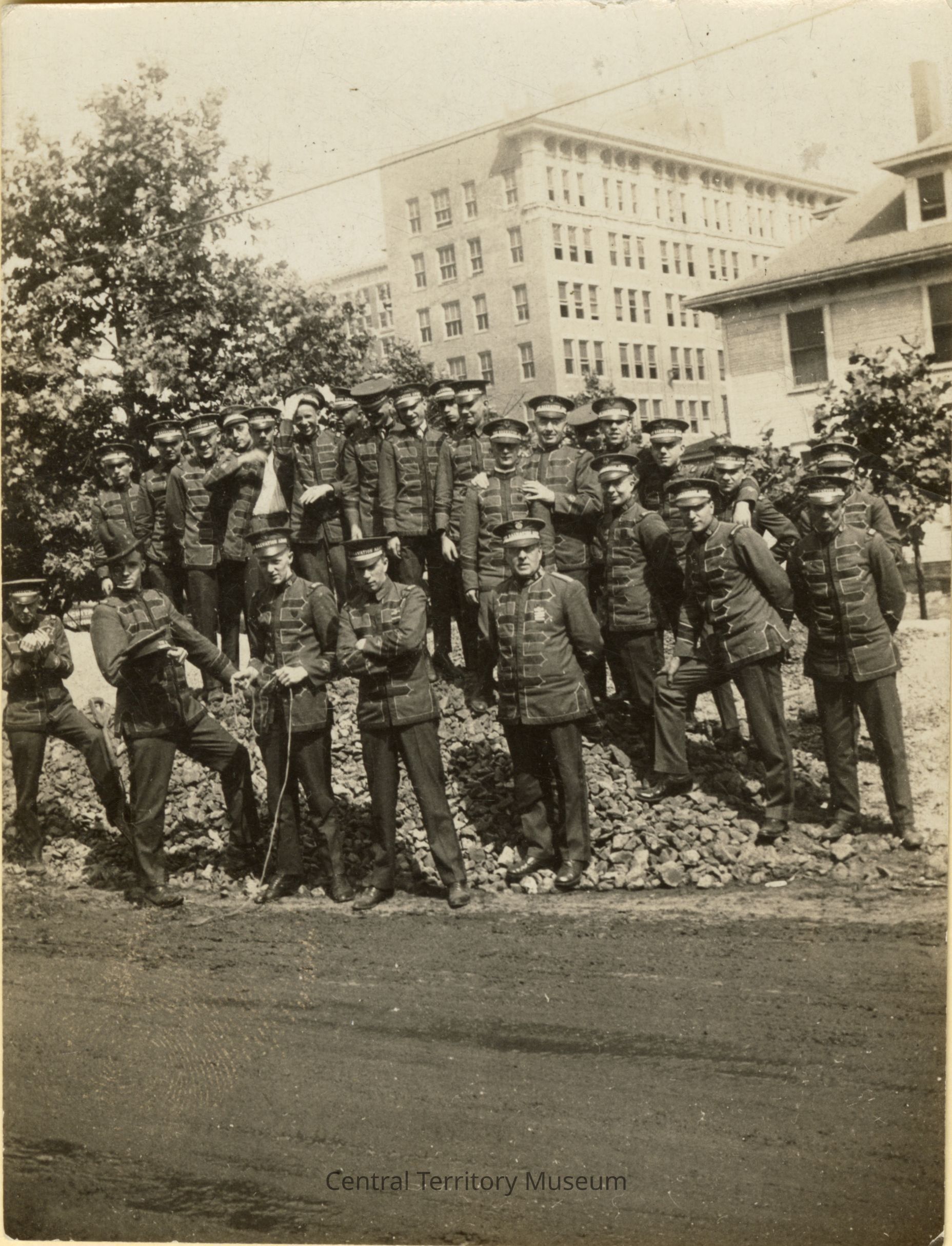 Snapshot of members of the Chicago Staff Band, taken in Wichita Falls, Texas during their 1917 Southern Tour. The men, in their band uniforms, are standing on a pile of rocks on a street in the town. A two story frame building can be seen behind them on the right and directly behind them is a large five story building.