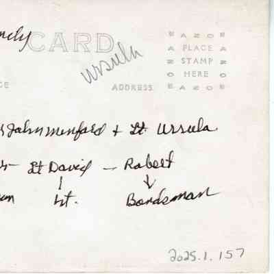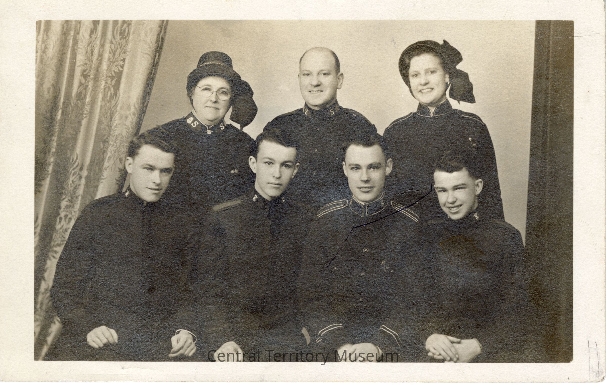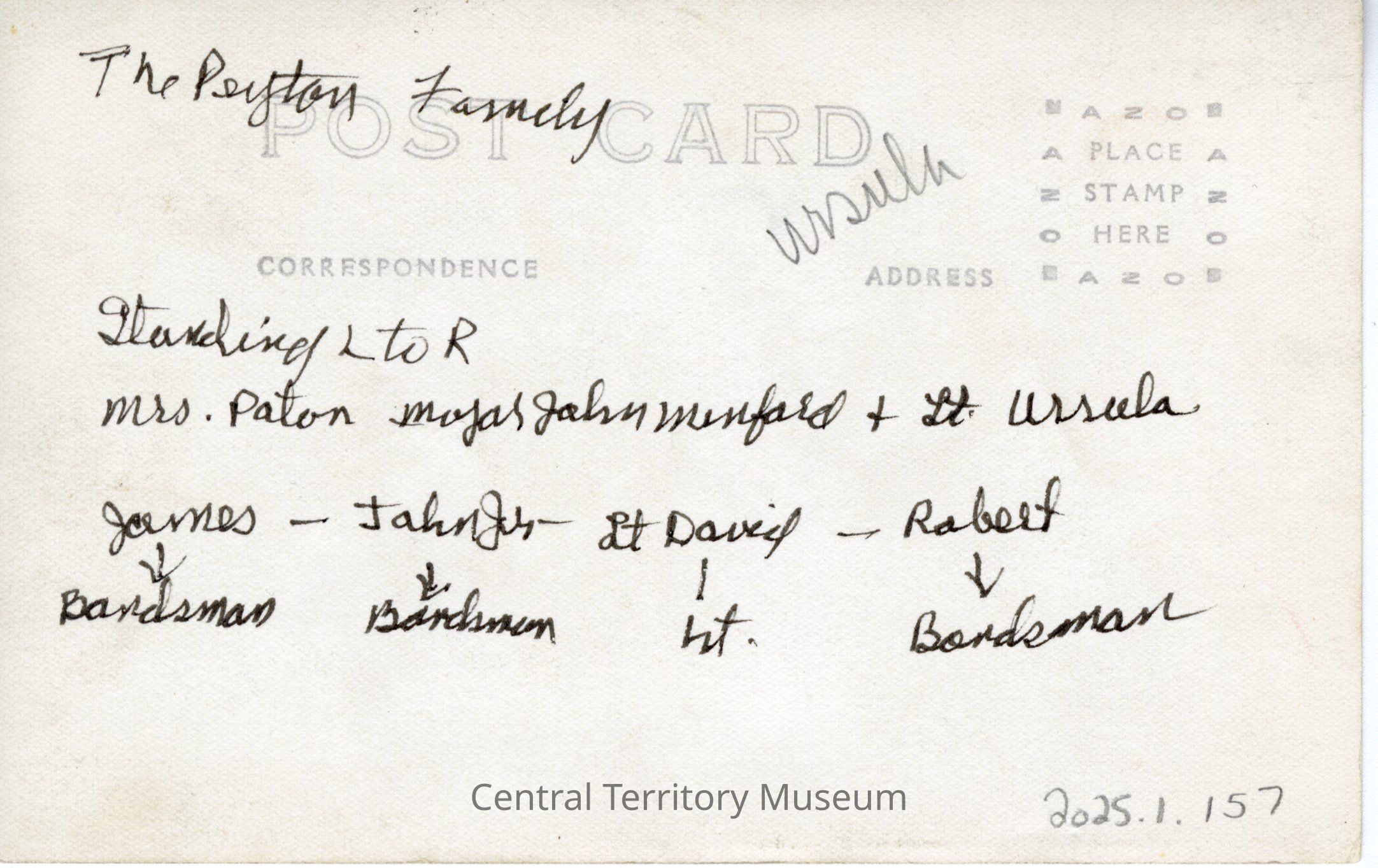 Photo postcard of the John M. and Jane Paton family. Seated in the first row are James Paton, John W. Paton, David M. Paton, and Robert Paton. Standing in the back row is Jane (McMahon) Paton, John M. Paton, and their adopted daughter Ursula Paton. Everyone is wearing a Salvation Army uniform and the women are both wearing bonnets. A handwritten note on the back identifies each person, including a note that James, John, and Robert were bandsmen while David and Ursula were lieutenants in The Salvation Army. The stamp box has AZO printed around it.