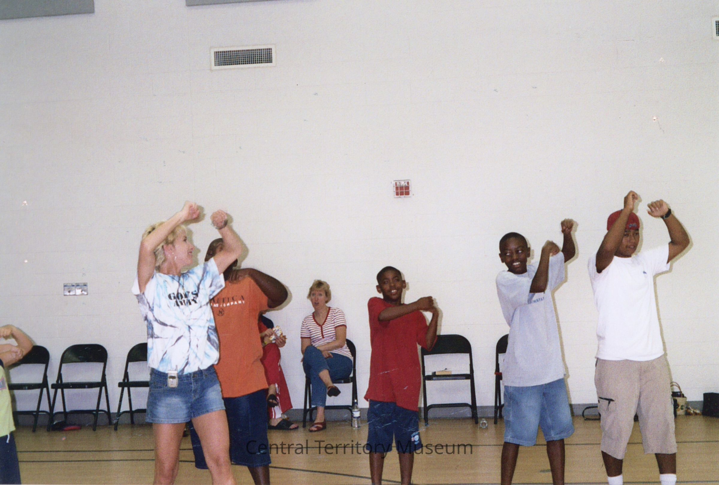 Color photo taken during a day camp hosted by the St. Charles (Tri-City), IL Corps. Three Black boys, standing on the right side, are engaged in a dance or exercise routine which is led by two women on the right. Another woman can be seen in the background, seated in a folding chair. The group appears to be in the corps gymnasium.Acquisition