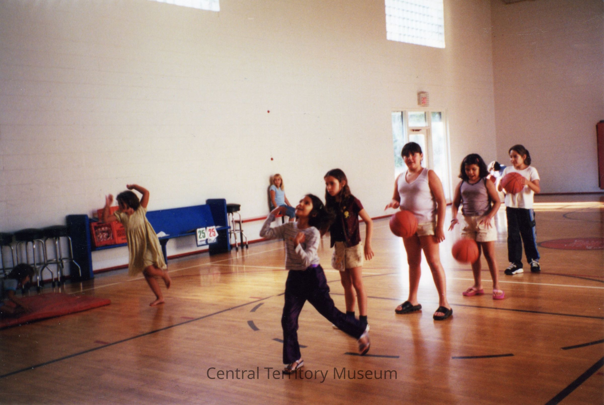 Color photo taken during a day camp hosted by the St. Charles (Tri-City), IL Corps. A group of girls are playing in the corps gymnasium and several of them are bouncing basketballs. A woman can be seen in the background, seated in a folding chair next to the wall.