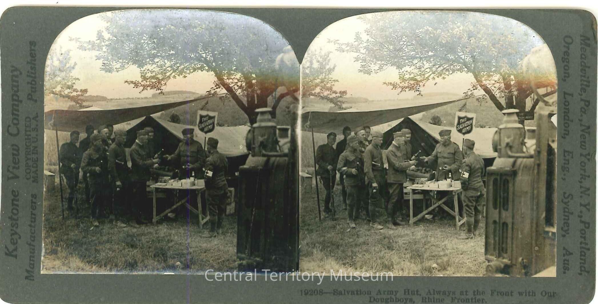 Stereoview of a Salvation Army Hut during WW I. Caption on the lower right front reads, "Salvation Army Hut, Always at the Front with Our Doughboys, Rhine Frontier."