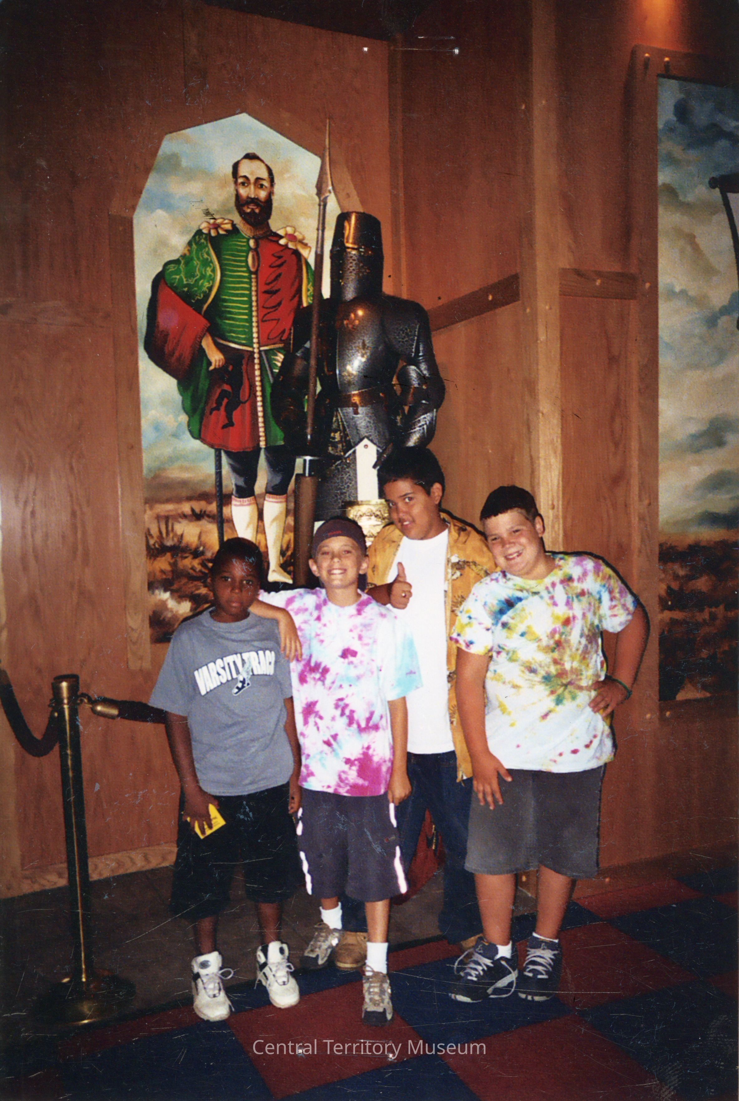 Color photo taken during a day camp hosted by the St. Charles (Tri-City), IL Corps. Four boys pose for the camera in front of a suit of armor. A color mural of an English man from medieval times is on the wall behind the armor.
