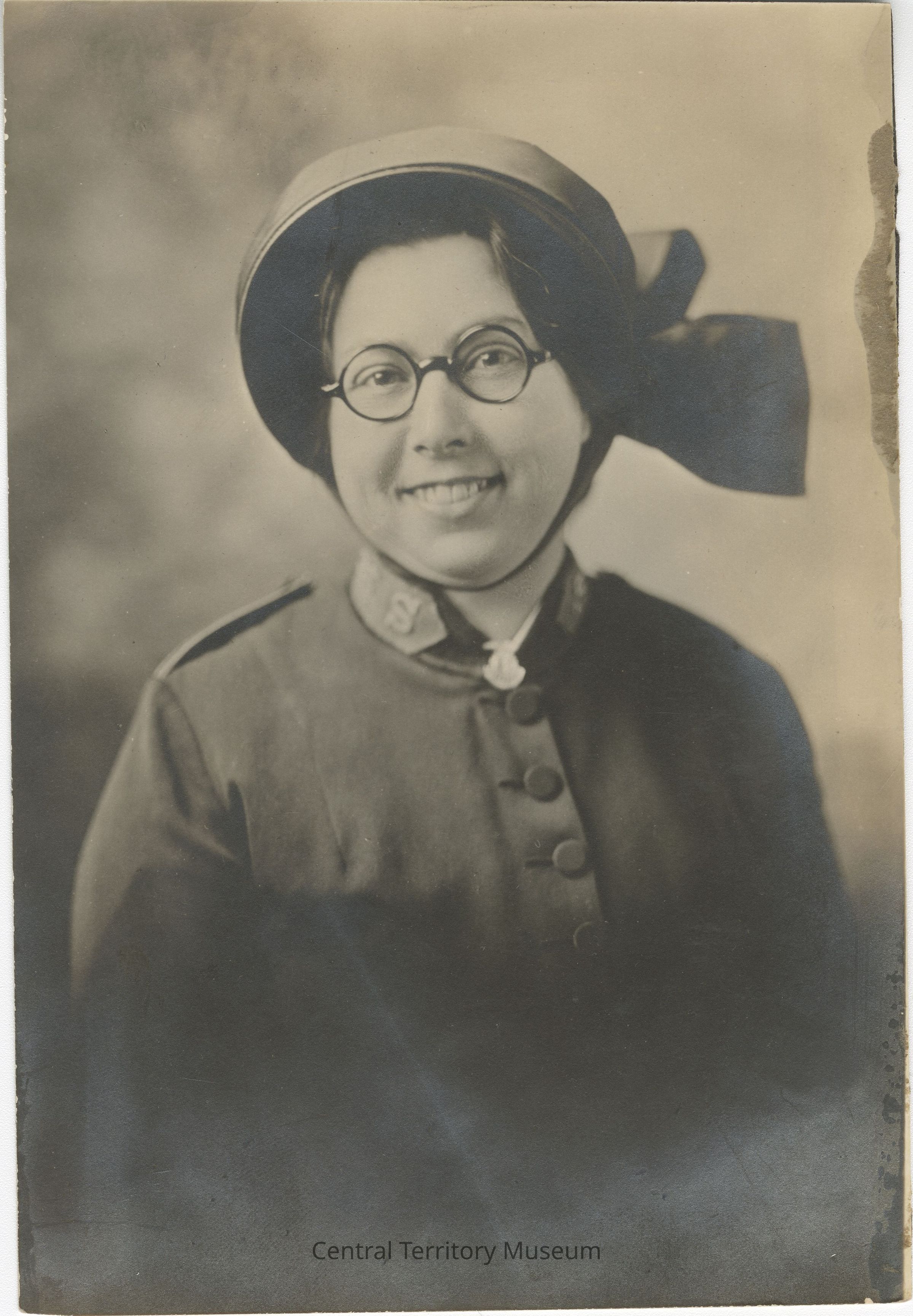 Black and white studio photograph of Alma (Nelson) Fristrup in a 1/4 headshot. She is wearing her Salvation Army uniform, bonnet with large bow in back, and round eyeglasses.