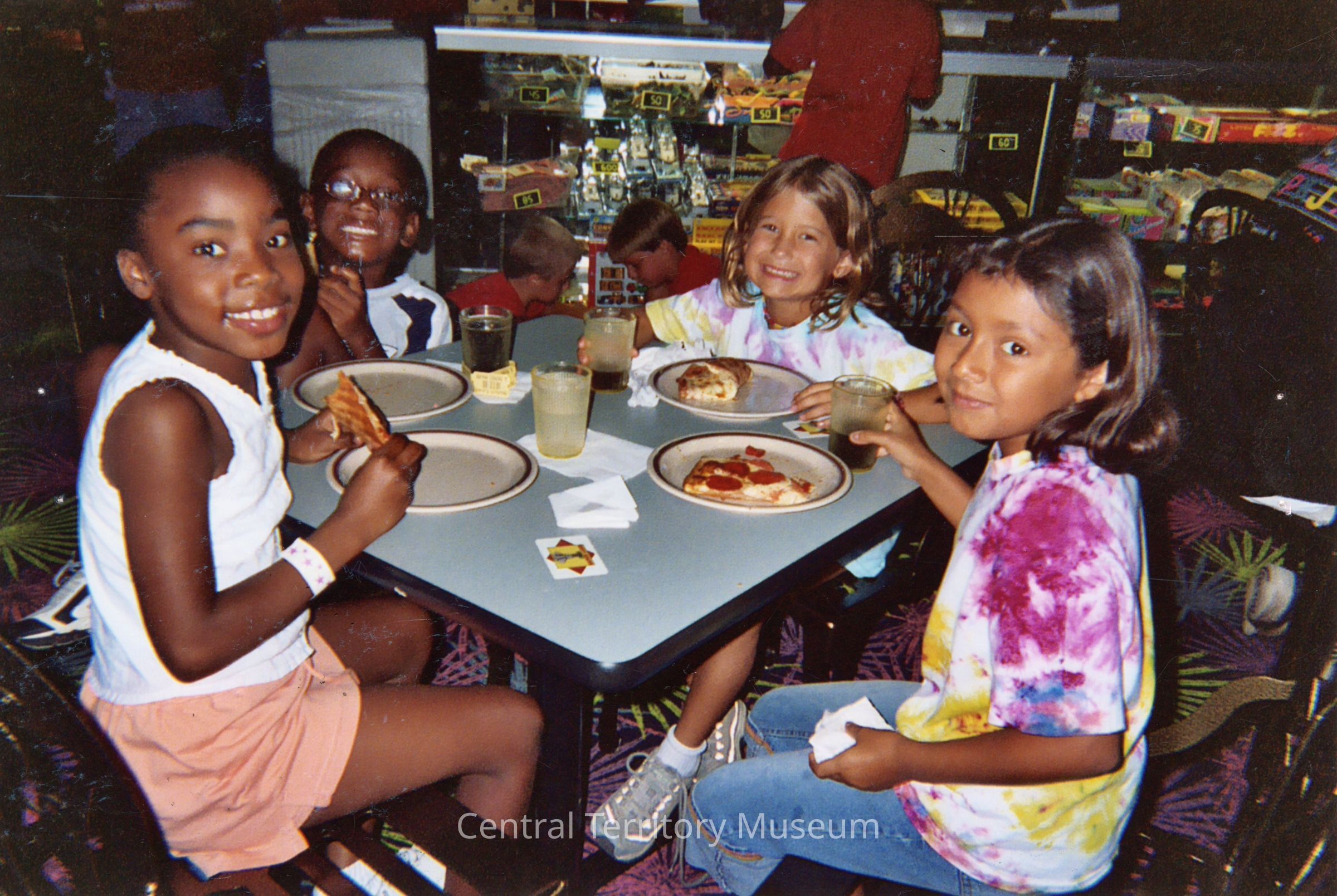 Color photo taken during a day camp hosted by the St. Charles (Tri-City) Corps. Four girls - two Black, one White, and one Latina - sit at a table eating pizza. Plates and glasses of soft drinks are in front of them.