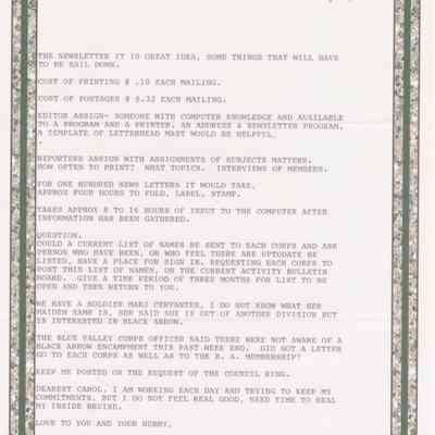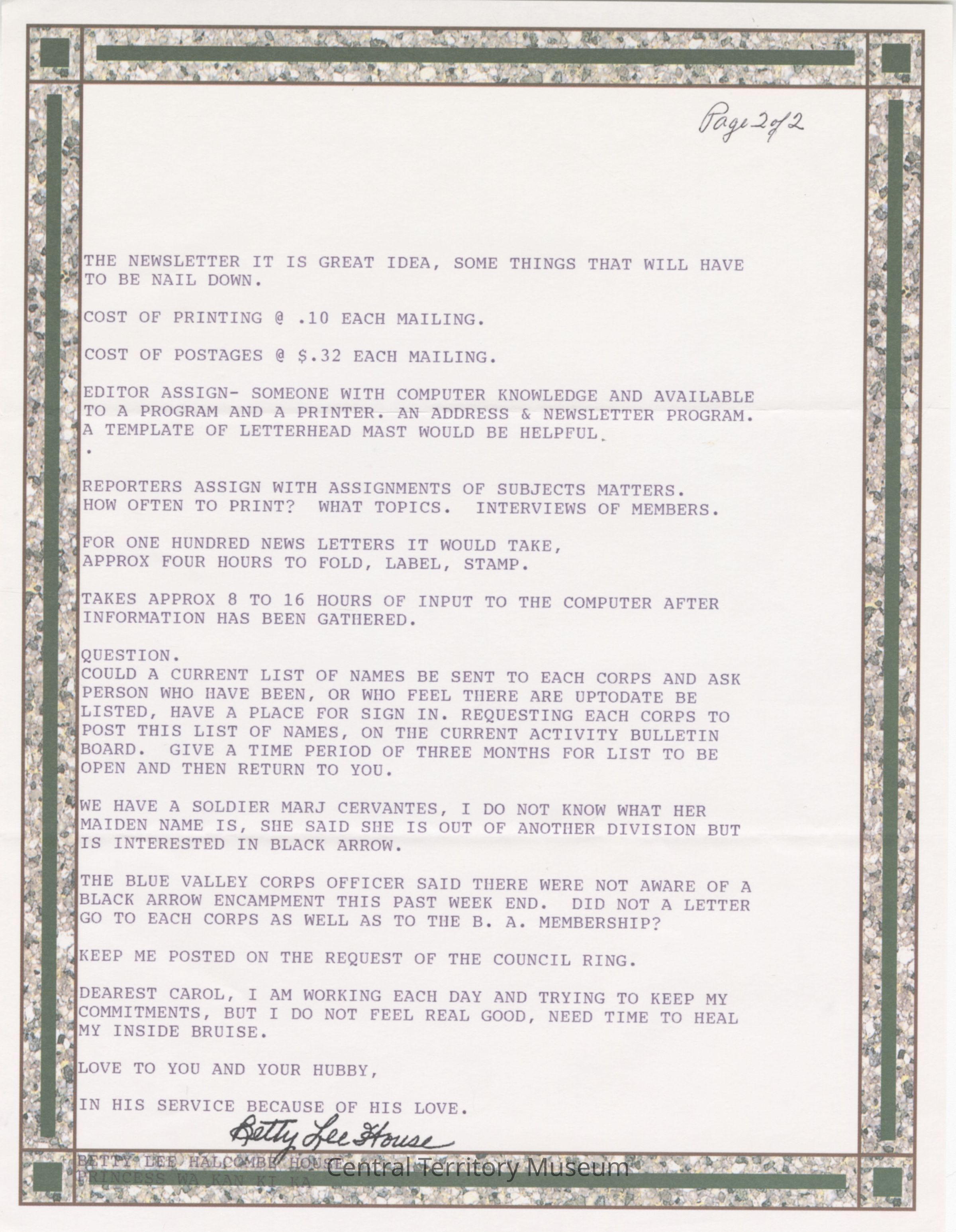 White, green, and blue correspondence letter. The boarder of the letter is green and brown with a marble-like design around the edges of the letter. The letter was written by Betty Lee House who is an Order of the Black Arrow member and the lead for the Black Arrow newsletter who attended the Black Arrow encampment at Camp Mo-Kan in the Kansas and Western Missouri Division from May 26th and 27th, 1995. The letter was to Captain Carol Lemirand in the Salina, KS Corps dated May 31st, 1995. The letter is a thank you letter to Captain Lemirand for organizing the Black Arrow encampment. On the first page of the letter, she details the events of how she got into a car crash on the way to the encampment. On the second page she lists ideas and questions for the creation of a Black Arrow newsletter.