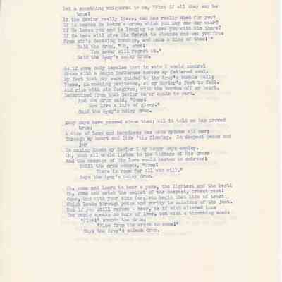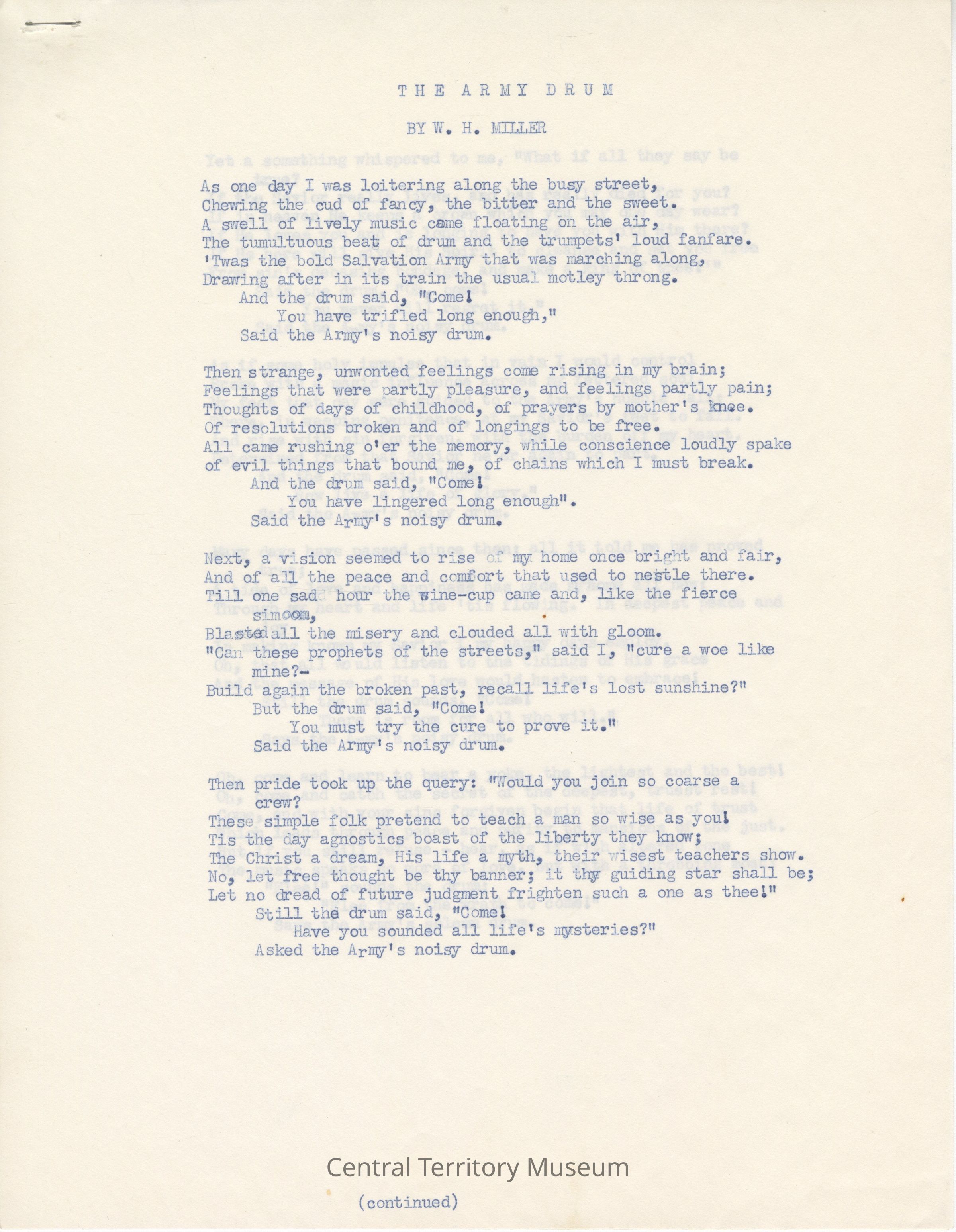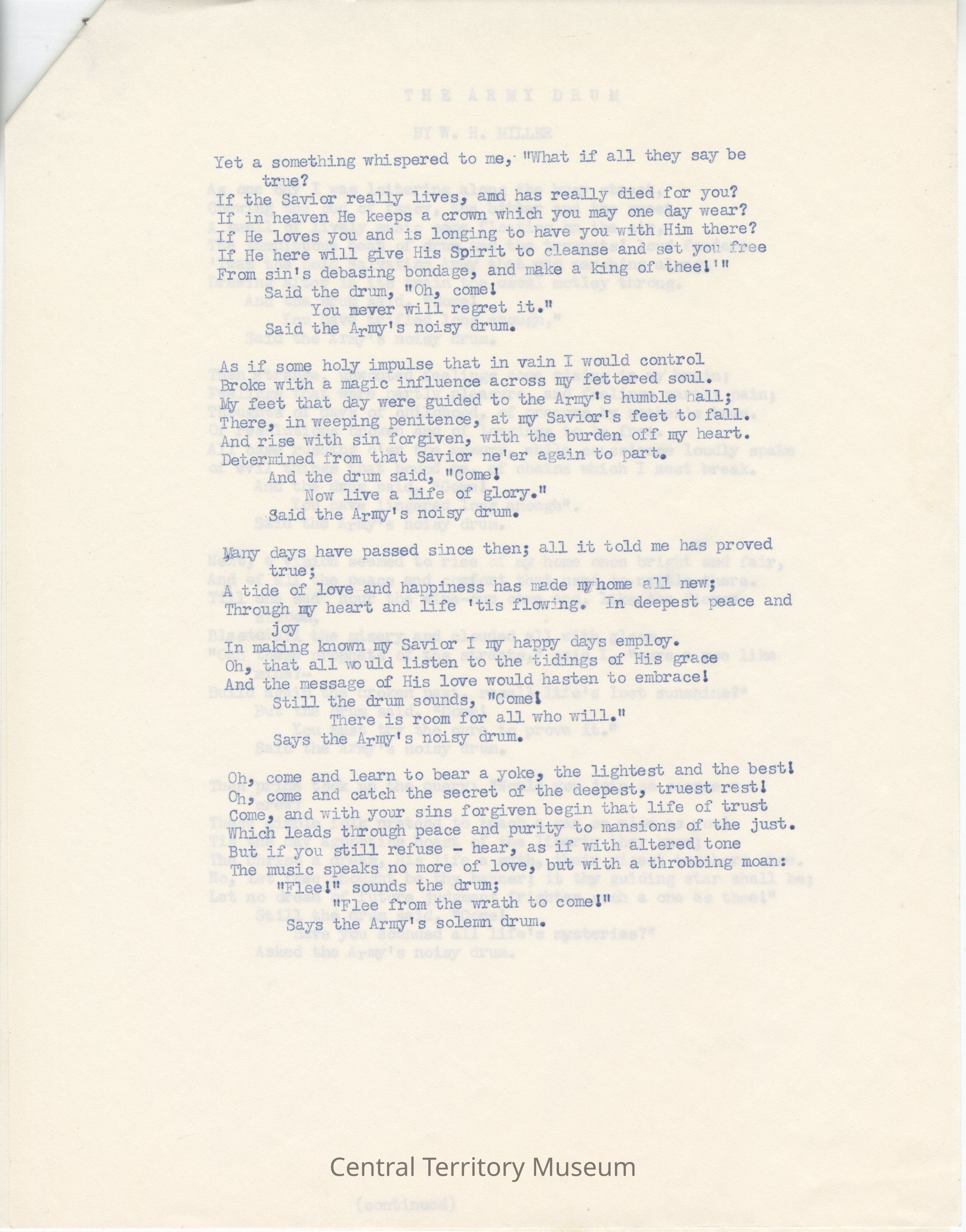 Typescript white paper with blue lettering. The text is a poem titled, "The Army Drum" written by W.H. Miller. It is written in a rhyming scheme of AABBCCDED. It is on two pages stapled together with 8 paragraphs. The poem is about the Salvation Army band drums calling for someone to come along thorugh their hardships. Each paragraph goes through key life experiences and feelings. The poem flows through someones life and each paragraph ends with the line, "Said the Army's noisy drum." The last paragraph is the end of someones life and the line changes to "Said the Army's solemn drum."