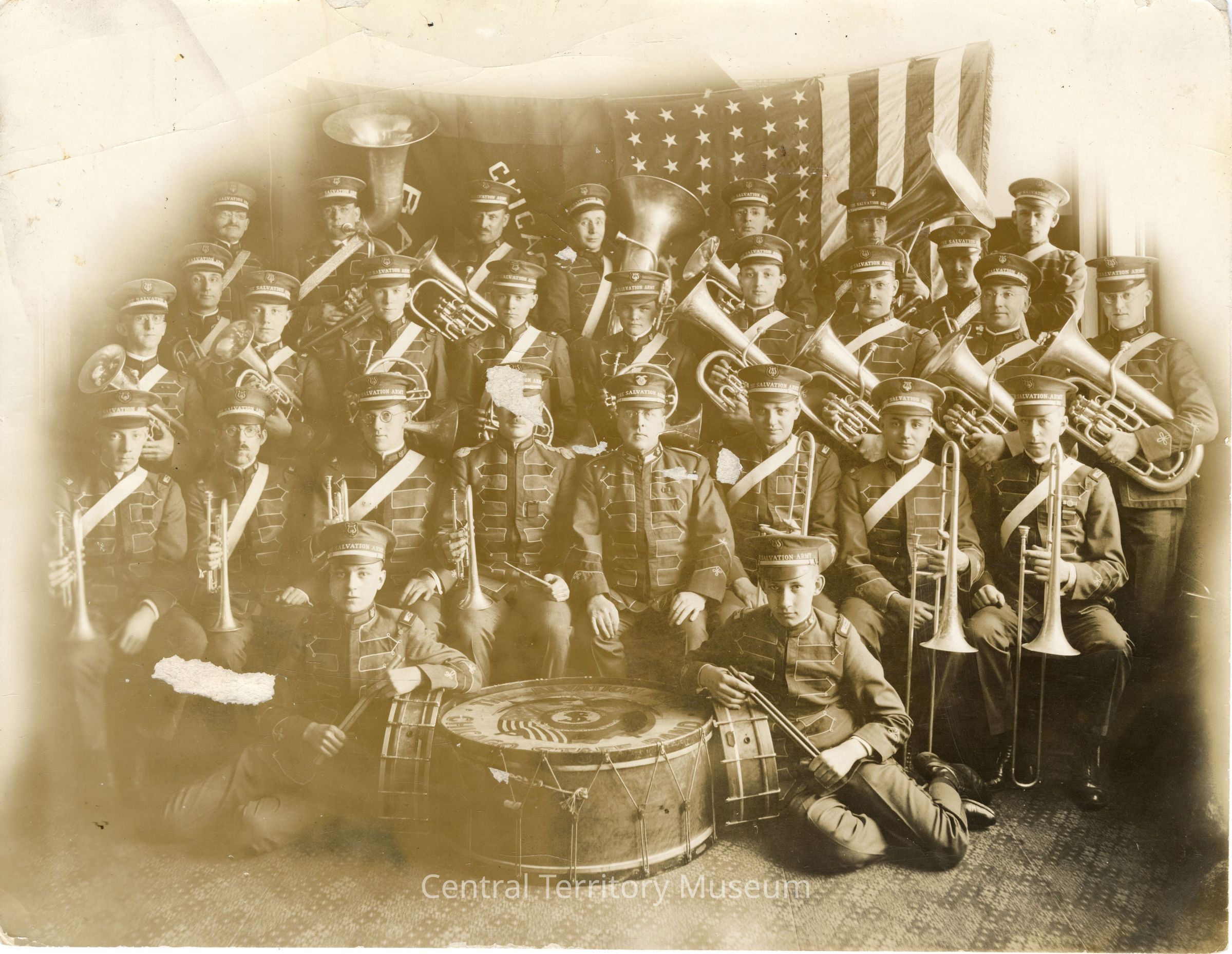 Formal photo of the Chicago Staff Band, 1920. The bandsmen are seated and standing, with each uniformed musician holding their brass horns. Two boys sit in front of the group, flanking the bass drum. They are wearing the same uniforms and each are leaning against a smaller drum and holding drumsticks. A large American flag can be seen hanging against the wall behind the men.Acquisition