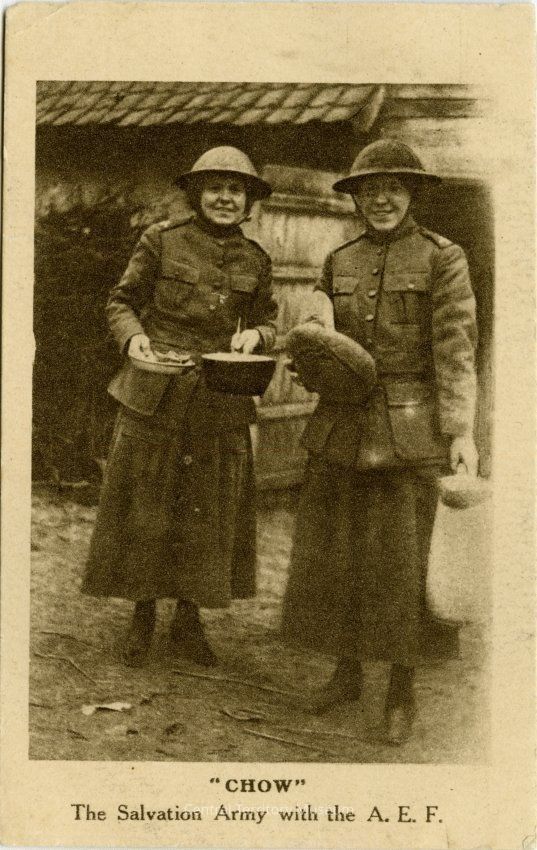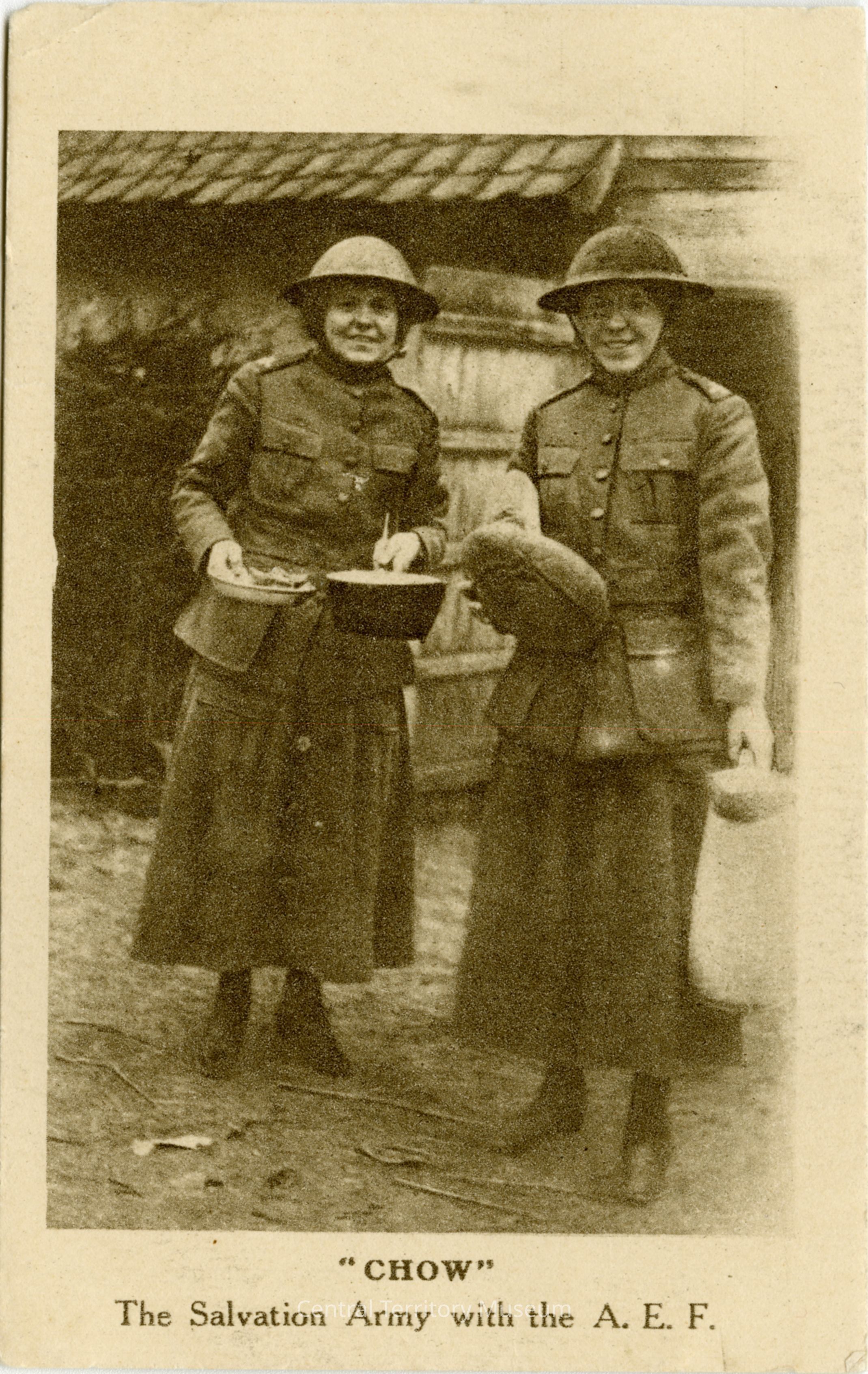 Postcard printed on creme colored cardstock. Front side contains a photographic reproduction of two female Salvation Army War Service workers (Doughnut Girls) holding bread, bowls and cookware. The women have been identified as Alice and Violet McAllister. The women wear Salvation Army uniforms and Brodie helmets. They stand in front of a rustic structure. A caption below the image reads: "'Chow' The Salvation Army with the A. E. F."