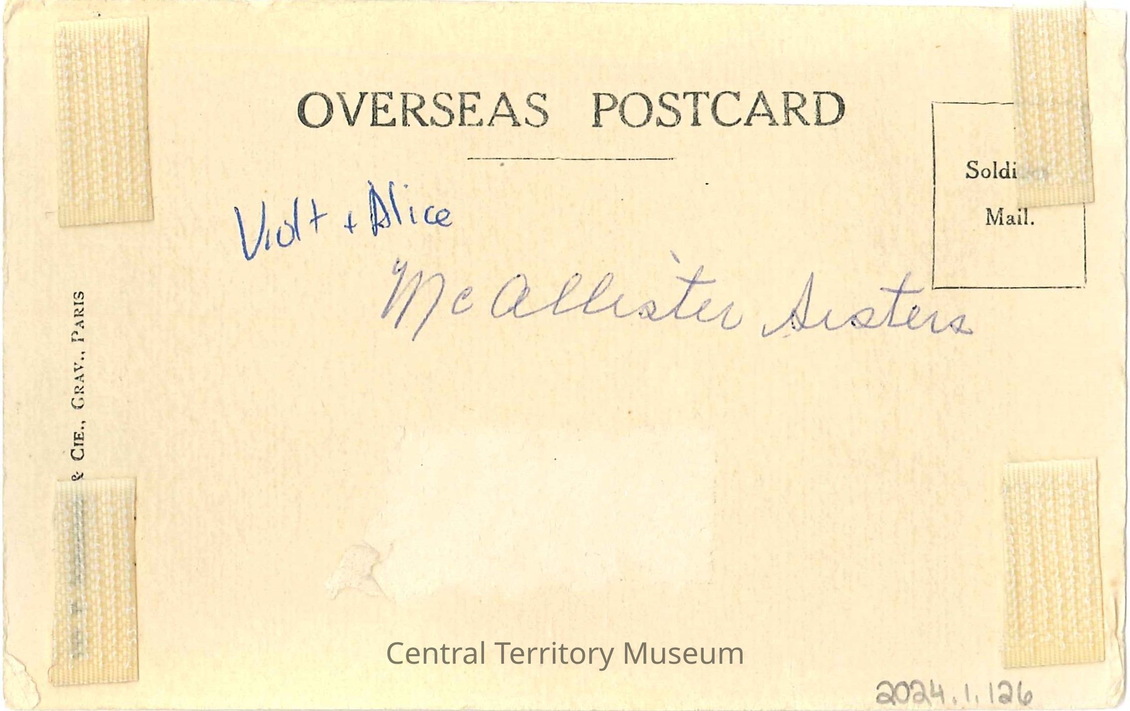 The back of the postcard contains publisher information in Paris, France (obscured by velcro), place for postage and markings indicating that this was intended for soldiers mail. Also present is a handwritten note identifying the women pictured on the front of the postcard.
