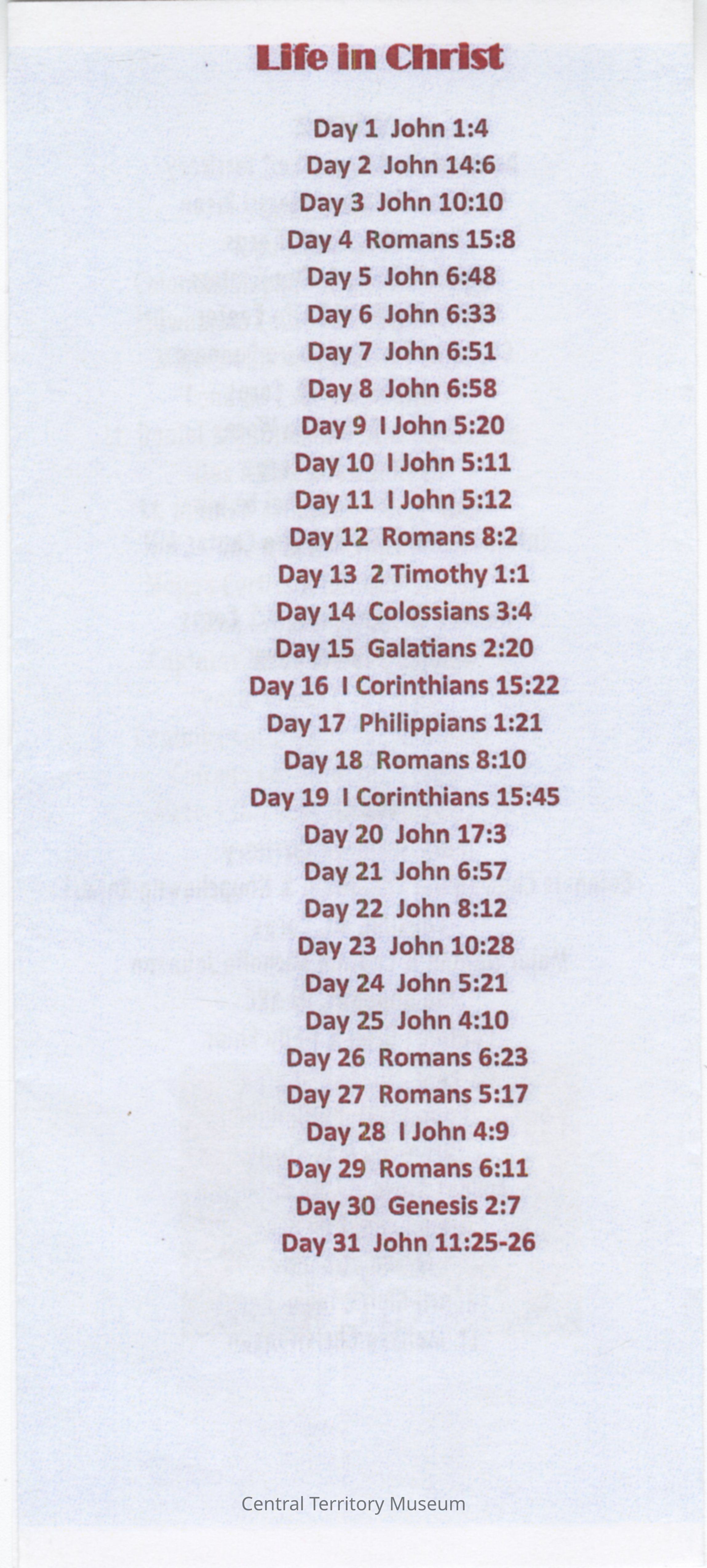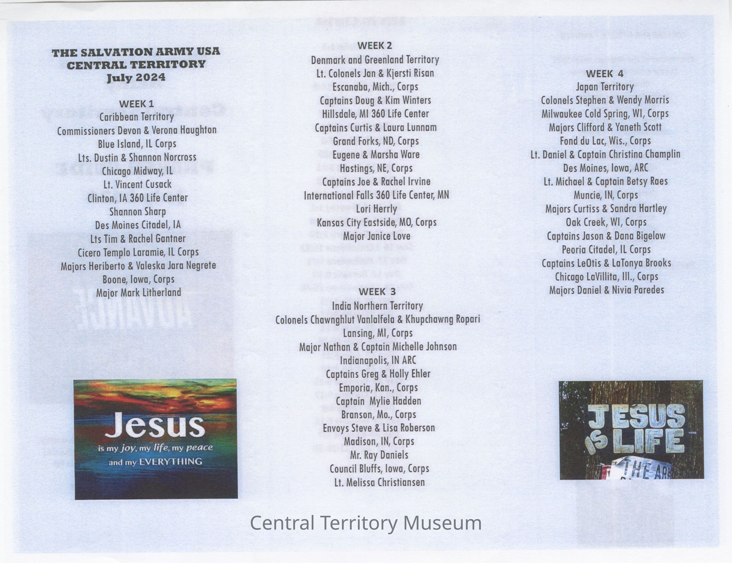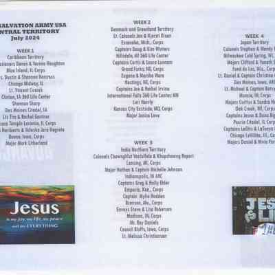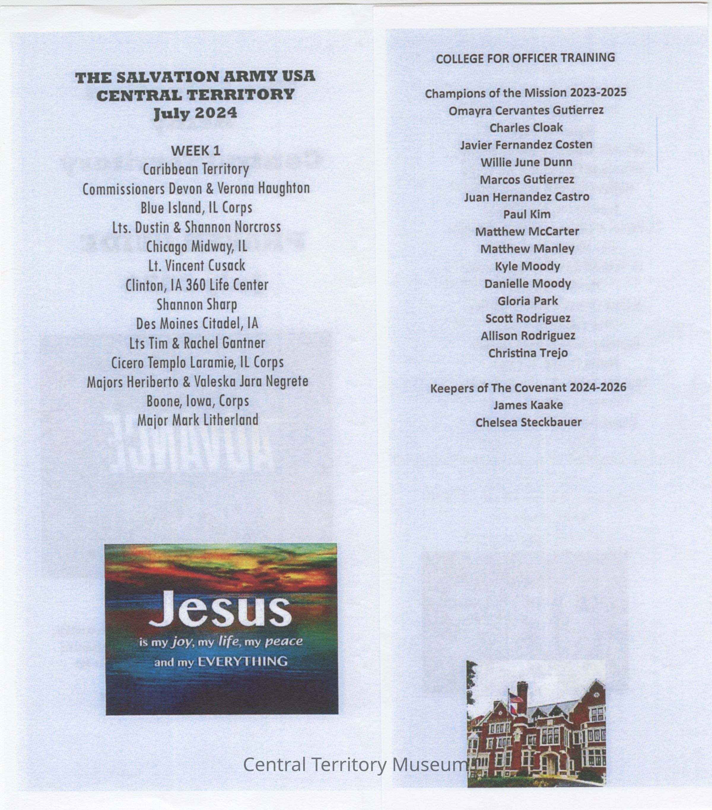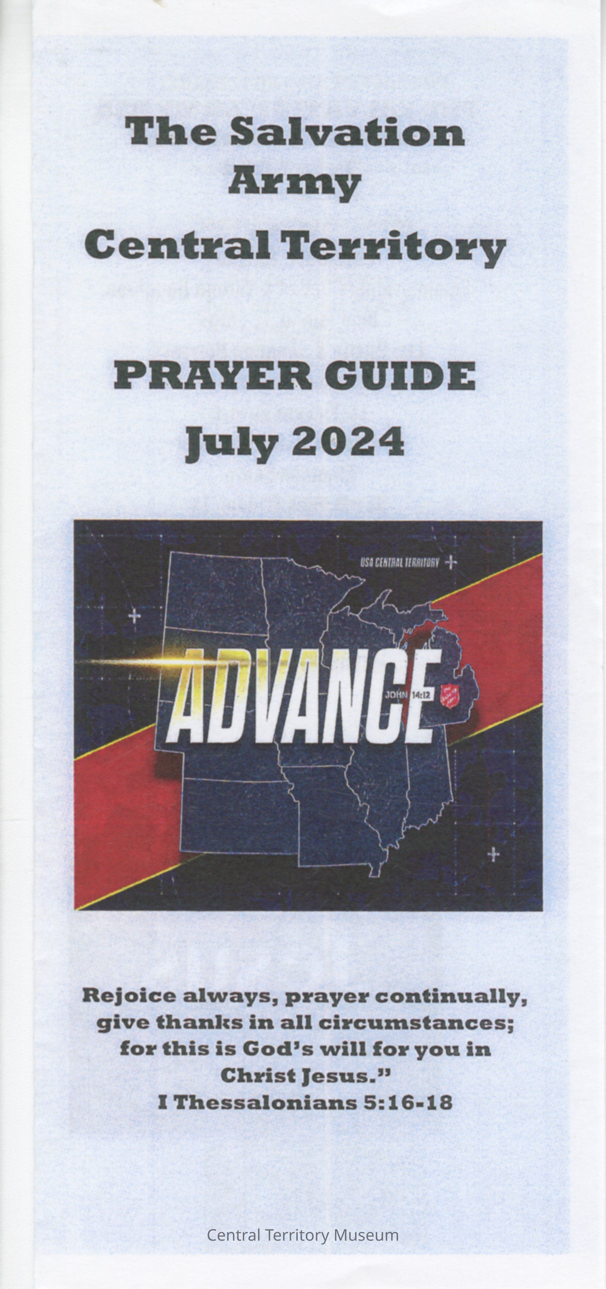 Tri-fold brochure for The Salvation Army Central Territory Chapel Prayer Guide for July 2024. Light blue paper with black lettering. The logo for Commissioning 2022 titled "Advance" is on the cover. There is a excerpt from I Thessalonians 5:16-18. Inside the brochure is a four week guide for prayers. Back has CFOT officers names from "Champions of the Mission 2023-2025." Also on the back has a day by day prayer guide.Acquisition