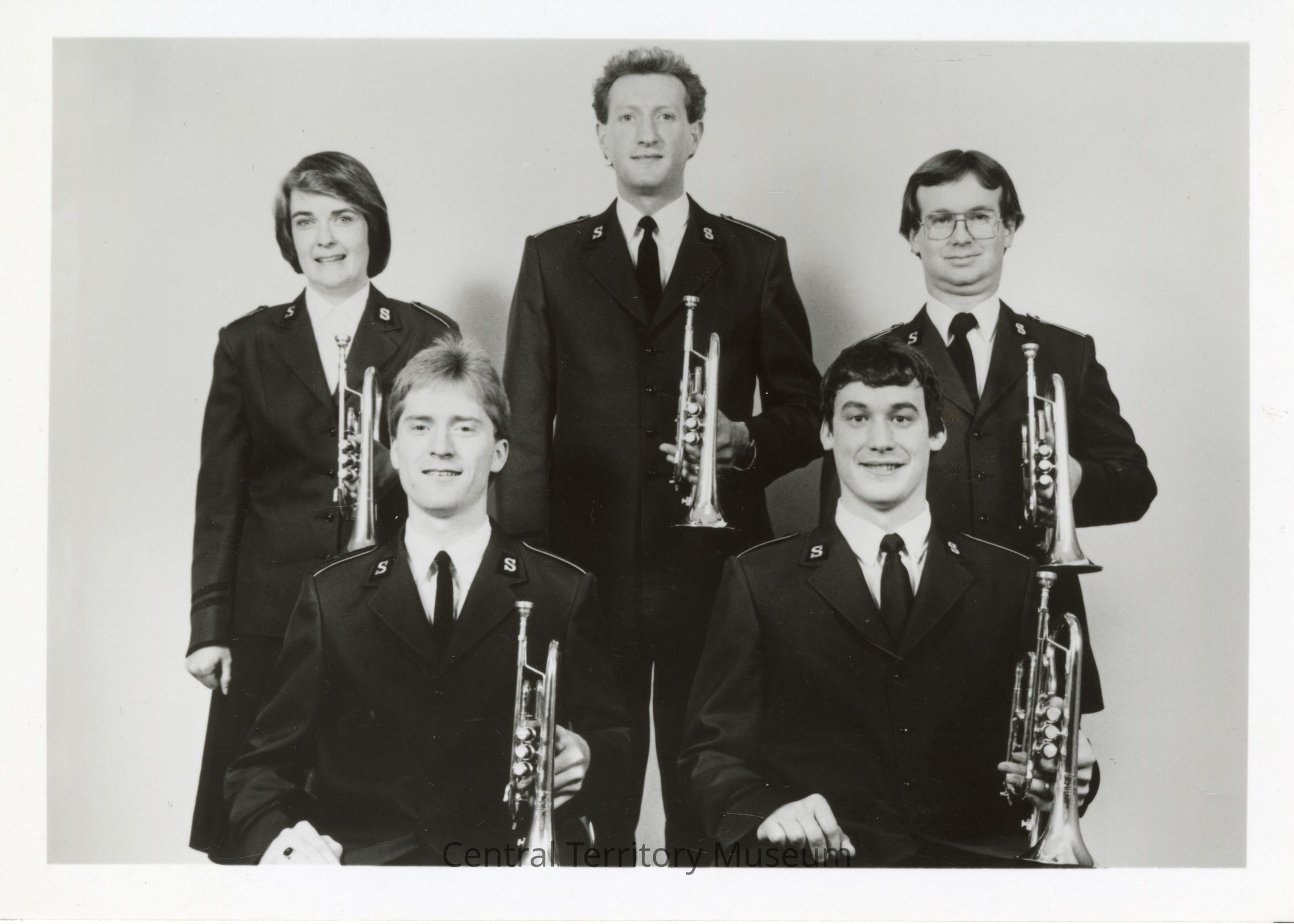 Formal photo of five members of the Chicago Staff Band. Peggy (Paton) Thomas is standing in the back row on the left. Each person is wearing their band uniform and holding a cornet.