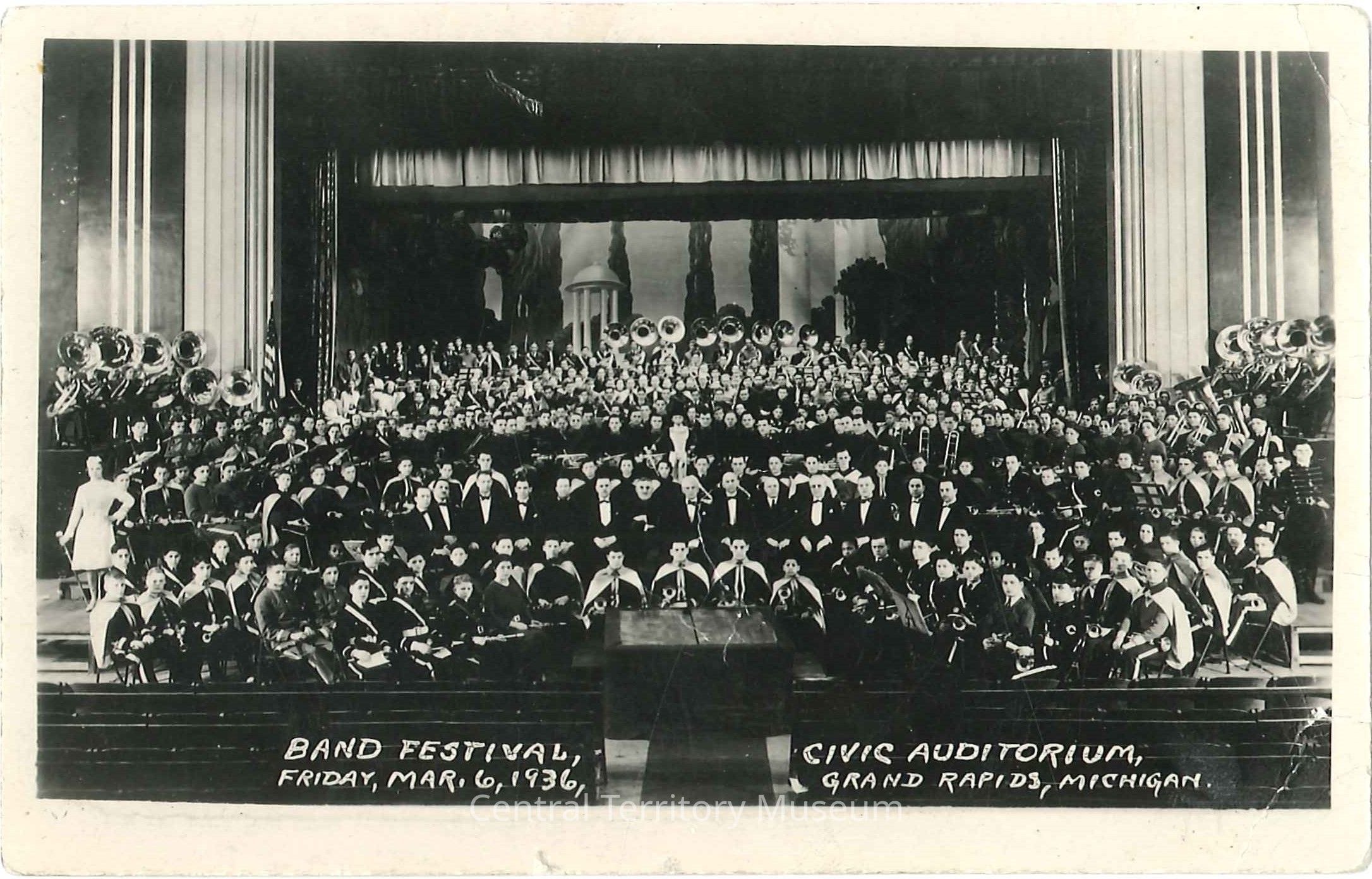 Postcard with a black and white photo of the musicians assembled in the Grand Rapids, MI civic auditorium for a band festival, Most of the men, women, and children are holding their instruments and wearing uniforms. The date and location are printed in white along the bottom edge of the image.Acquisition