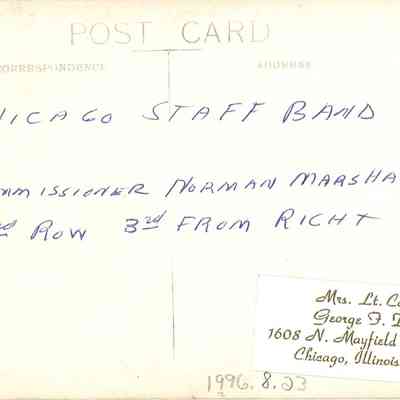 The back of the postcard has an inscription, written in blue ink, which reads "Chicago Staff Band / Commissioner Norman Marshall Sr 2nd row 3rd from right". The photography studio name and address is stamped on the left side.