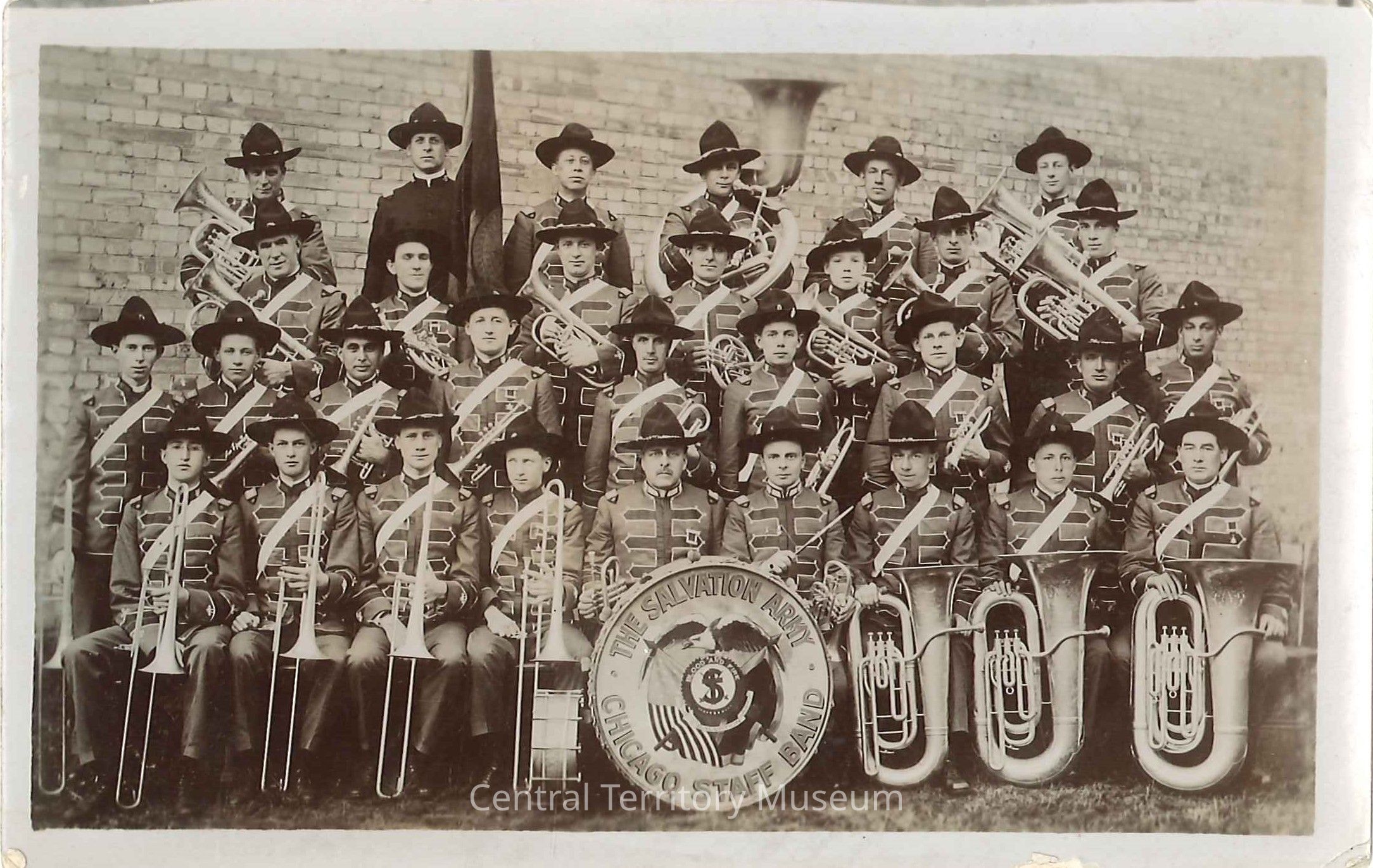 Postcard with a photo of the Chicago Staff Band in 1914. The bandsmen are arranged in four rows, seated and standing, and appear to be outdoors. A brick wall or building can be seen behind them. Each musician is wearing their band uniforms and a campaign style hat and most are holding a brass instrument. The band's bass drum is standing in the center of the first row and has The Salvation Army crest and the band name printed on the drumhead. A small drum is standing next to it. A man in the back row is standing next to a flag.