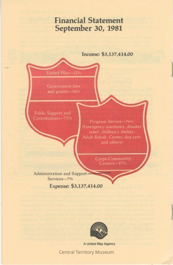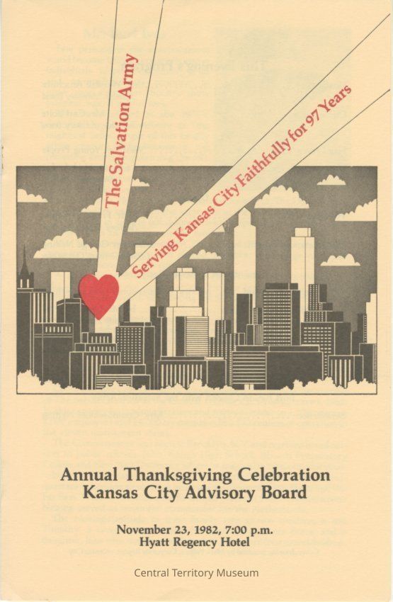 Tan, black, and red program. On the cover there is a graphic of a city skyline with a red heart at the top of one of the buildings. There are two beams shooting out of the red hear that read, "The Salvation Army Serving Kansas City Faithfully for 97 Years." This program is for the Annual Thanksgiving Celebration for the Kansas City, MO Advisory Board. It was held at the Hyatt Regency Hotel on November 23rd, 1982 at seven p.m. The inside has information regarding award winners for that year and corps community information. The back has the financial statement from September 30th, 1981 where the income was $3,137,414.Acquisition