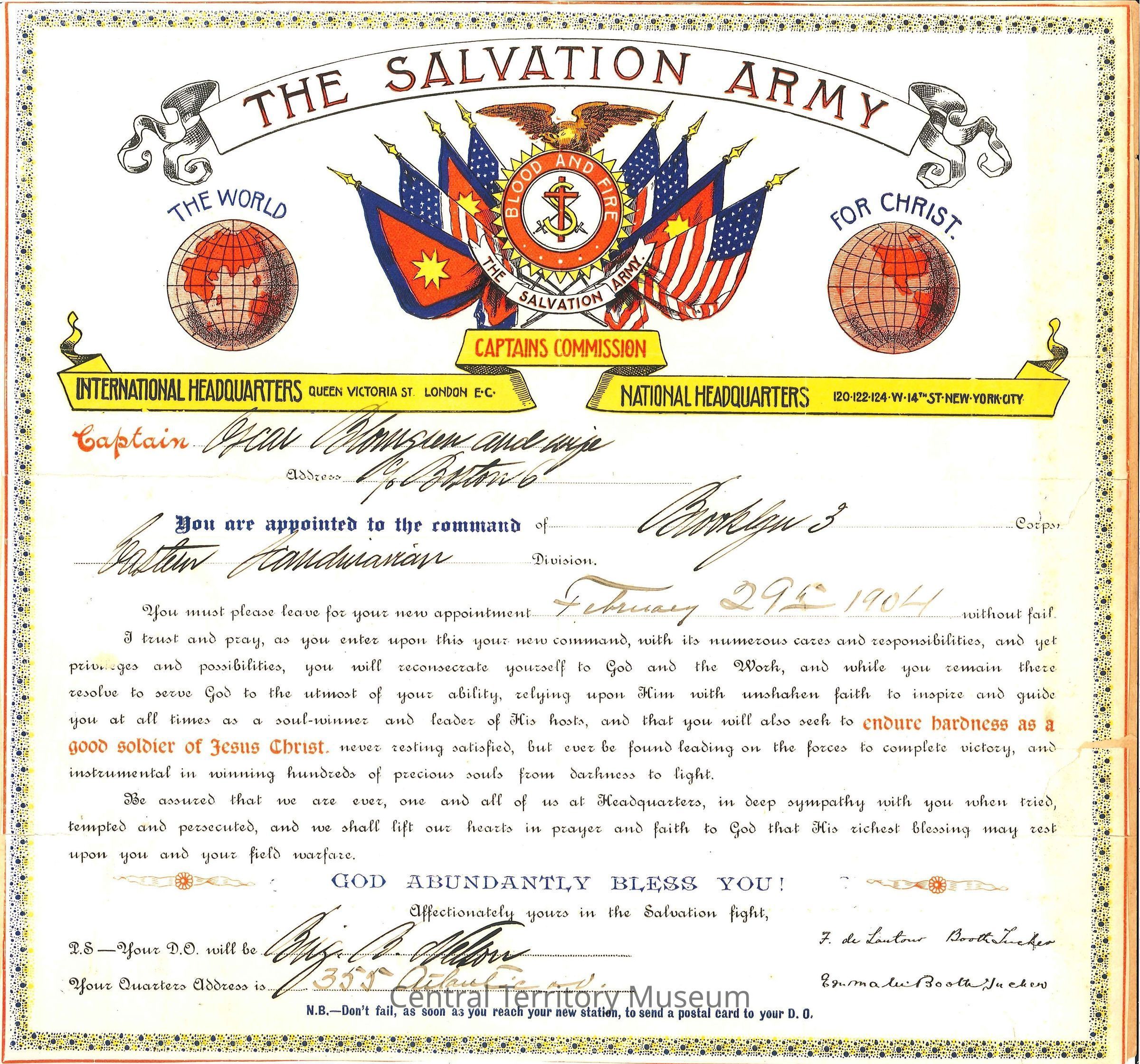 Certificate, Captain's Commission, issued to Oscar Blomgren and wife, appointing them to the command of Brooklyn 3 corps of the Eastern Scandinavian Division. The certificate also includes the name of their Divisional Officer and the address, 355 Atlantic Ave in Brooklyn, of their quarters. The document is signed by F. de LaTour Booth-Tucker and Emma Booth-Tucker.