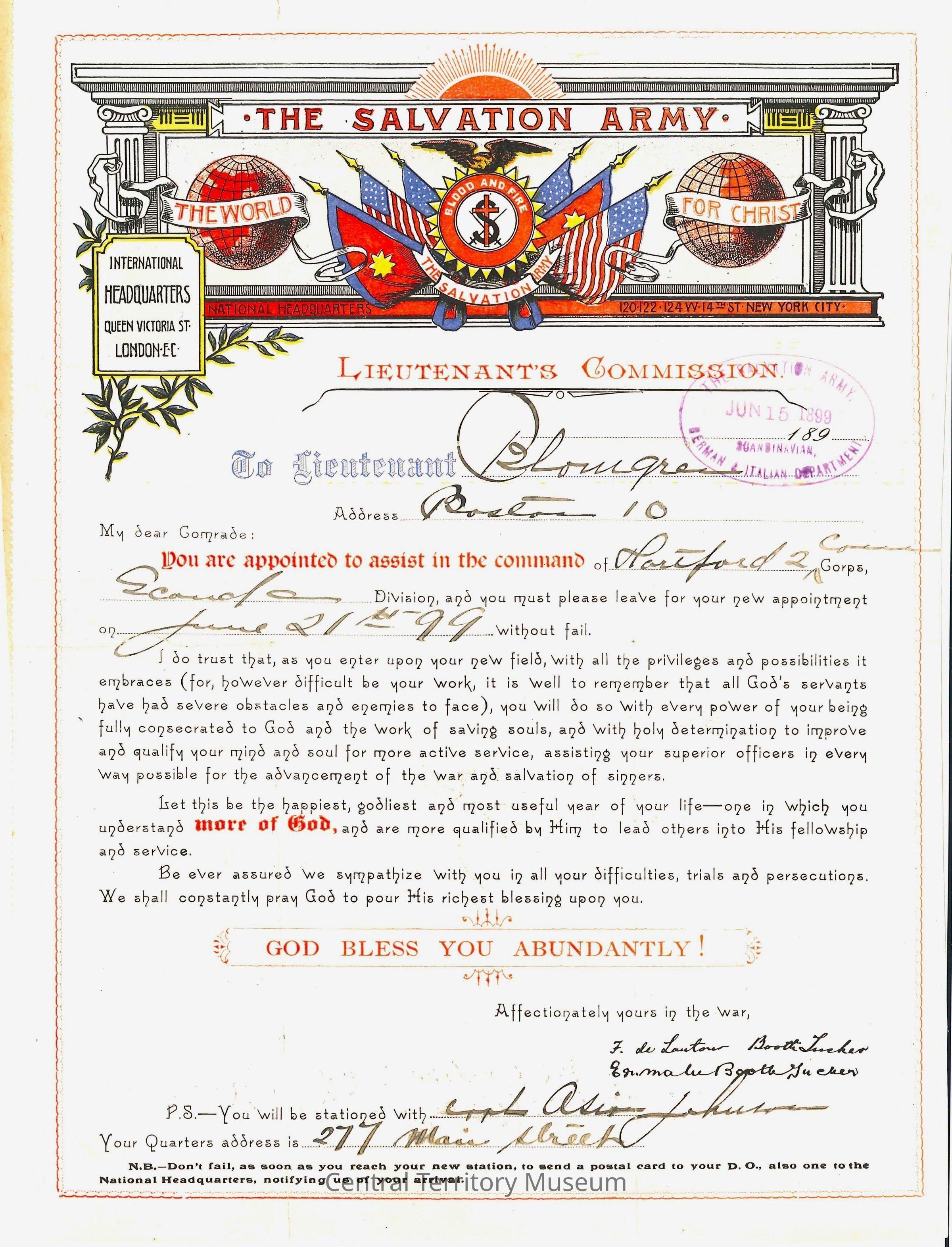 The certificate is printed in multiple colors on cream colored paper, starting with a red line forming a frame around the text. At the top of the document is a banner with The Salvation Army printed on it, just below are globes to the left and right of the crest surrounded by flags and topped with an eagle.Acquisition