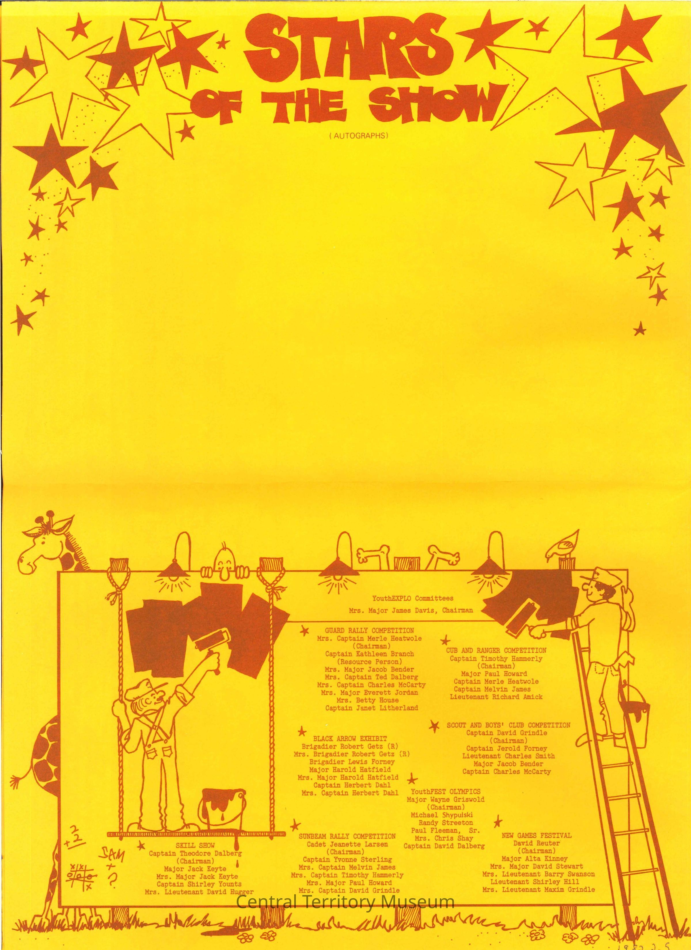 Program, quarter fold, from the 1982 Youth Explo, held in Grant Park, Chicago, Illinois. The cover page is folded in half, with one half containing a graphic of clouds and stars exploding off a main cloud that contains the title, location, and date. The other half contains caricature illustrations of people of different ages and occupations. The interior page has illustrations and text blocks highlighting the array of activities, rallies, parades, and demonstrations taking place. The brochure opens up further into a large illustration highlighting not just The Salvation Army Explo taking place in Grant Park but also highlights of Chicago from Soldier Field to the Picasso sculpture, Sears Tower, the John Hancock, and Lake Michigan. The final page has a half page, decorated with stars, intended for autographs, and a half page listing all of The Salvation Army officers and cadets who worked on creating the Explo.Acquisition