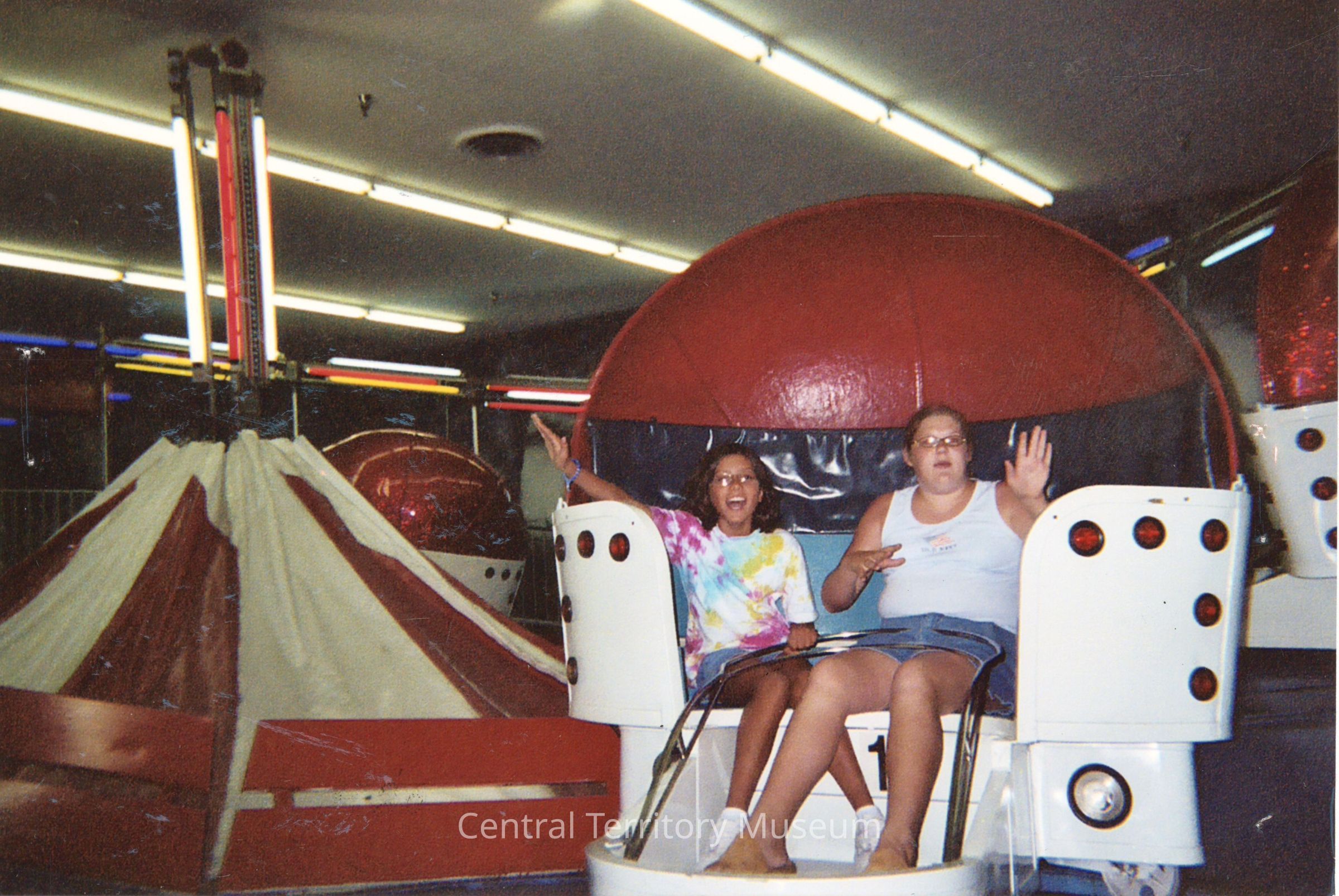 Photo taken during a day camp hosted by the St. Charles (Tri-City), IL Corps. Two girls, seated in an amusement ride, wave at the photographer.