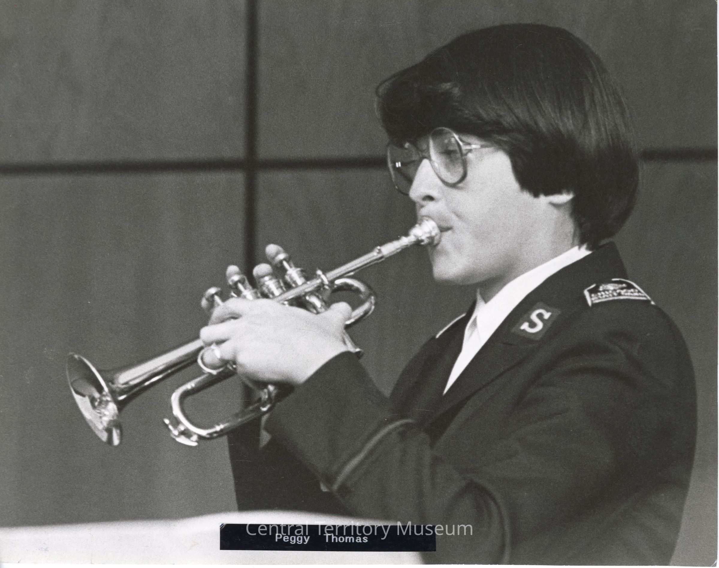 Photo of Peggy (Paton) Thomas playing her cornet. She is wearing her dark blue Salvation Army Chicago Staff Band uniform. Her dark hair is styled in a bob cut and she is wearing eyeglasses.