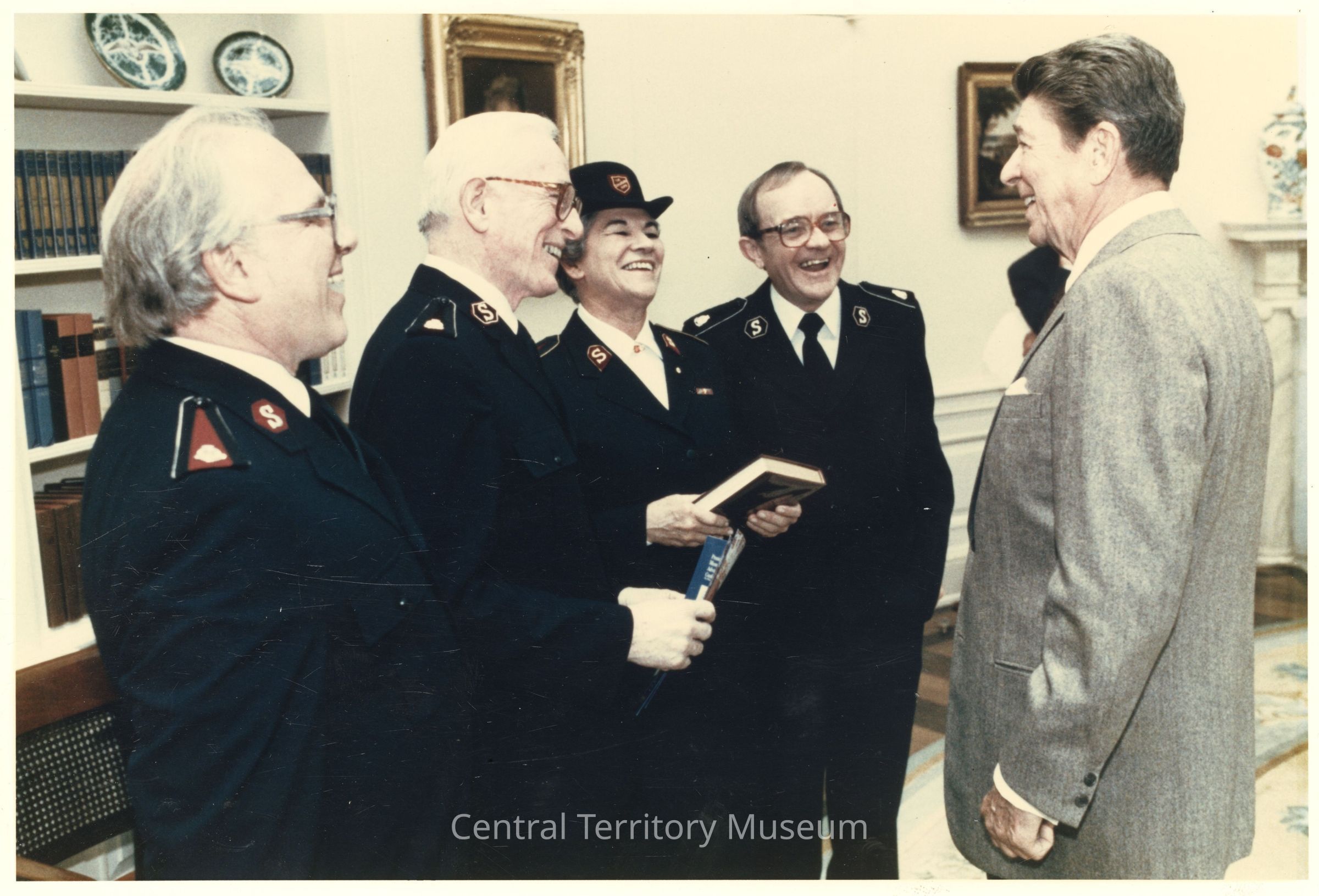 This photo depicts President Ronald Reagan, wearing a light gray suit, standing on the right side talking with General Eva Burrow (center), Commissioner Andrew Miller (left), Commissioner Norman Marshall (second from left), and Colonel Ernest Miller (right).