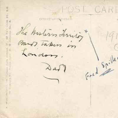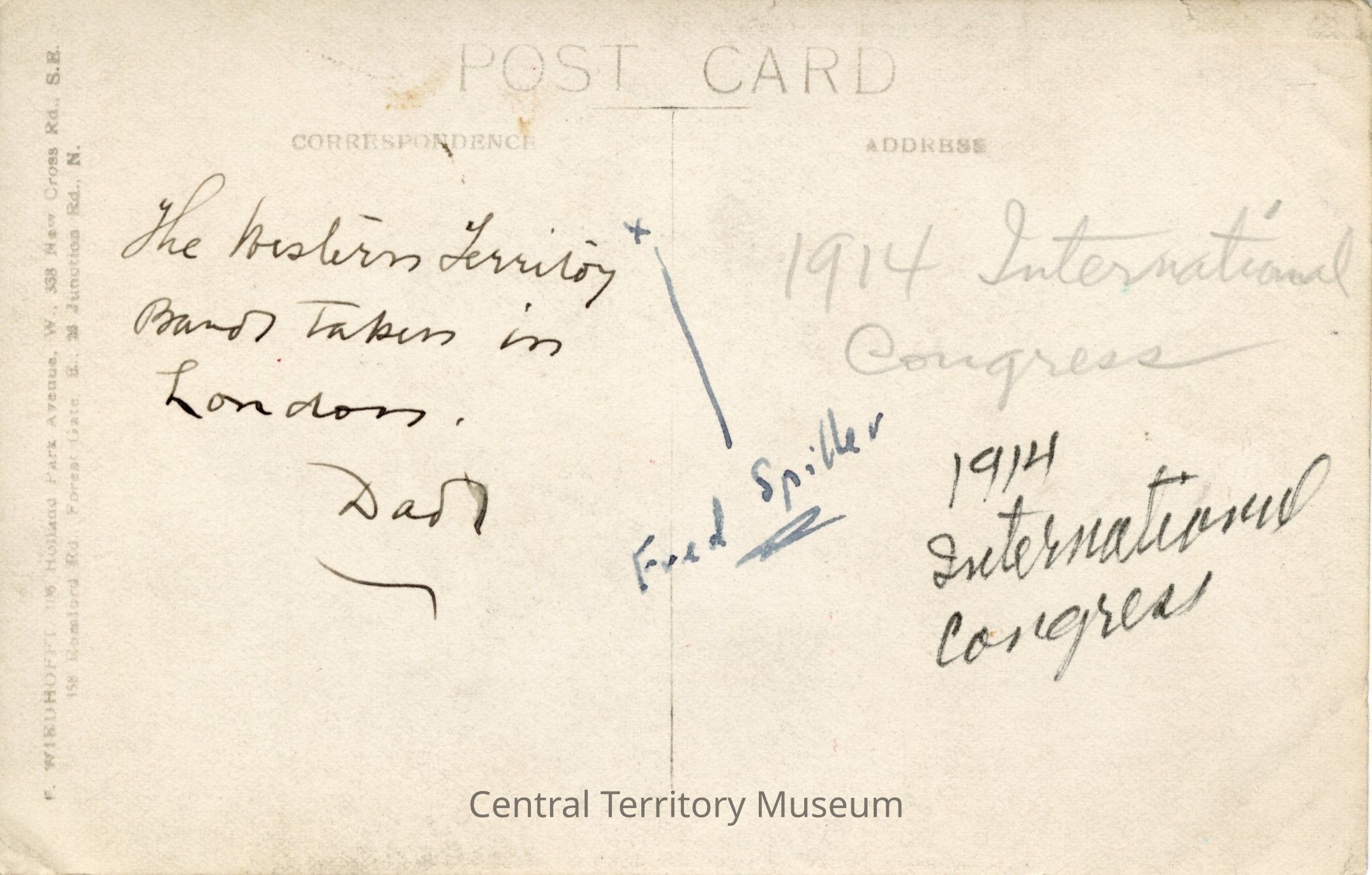 The back of the postcard has a T shaped line separating the correspondence and address sections and the word POST CARD is printed above it. The photography studio, F. Wiedhofft, is printed on the left side with several different addresses in London. A handwritten note, in black ink, reads "The Western Territory Band taken in London Dad" is in the correspondence area. A notation, "Fred Spiller" with a line drawn to an X mark is next to it and "1914 International Congress" is next to that. A penciled inscription also notes the event as the 1914 International Congress.Acquisition