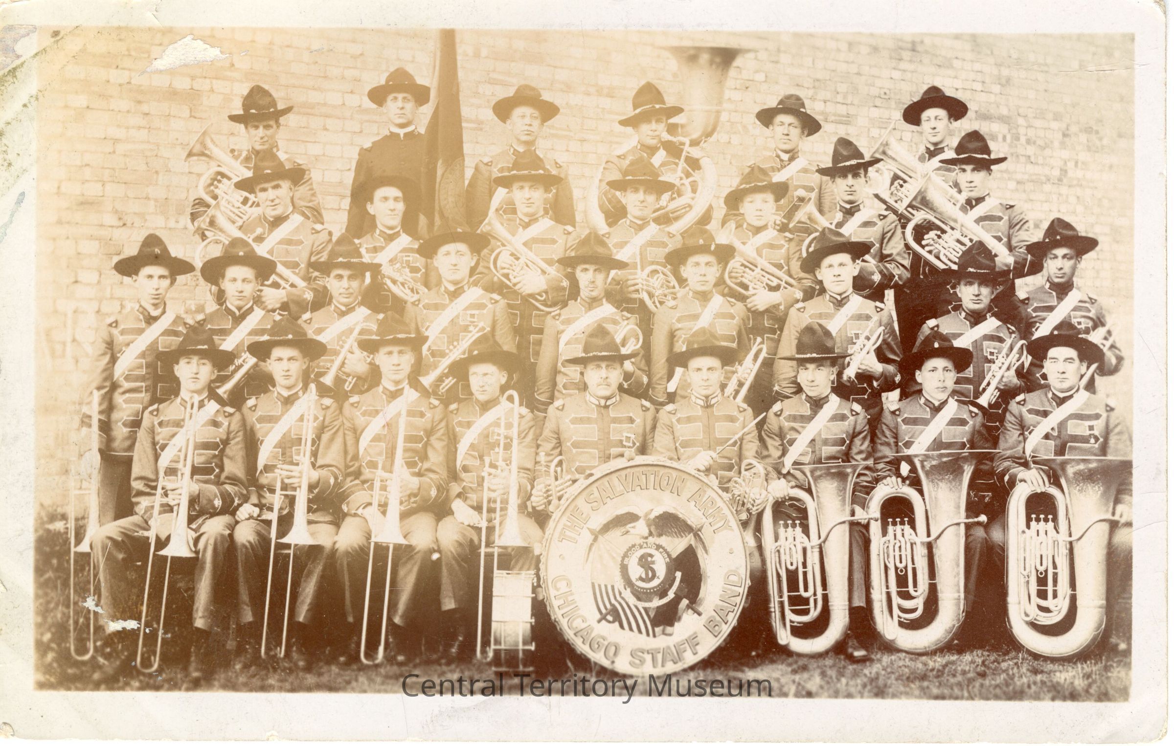 Postcard with a photo of the Chicago Staff Band in 1914. The bandsmen are arranged in four rows, seated and standing, and appear to be outdoors. A brick wall or building can be seen behind them. Each musician is wearing their band uniforms and a campaign style hat and most are holding a brass instrument. The band's bass drum is standing in the center of the first row and has The Salvation Army crest and the band name printed on the drumhead. A small drum is standing next to it. A man in the back row is standing next to a flag. A white border surrounds the photo.
