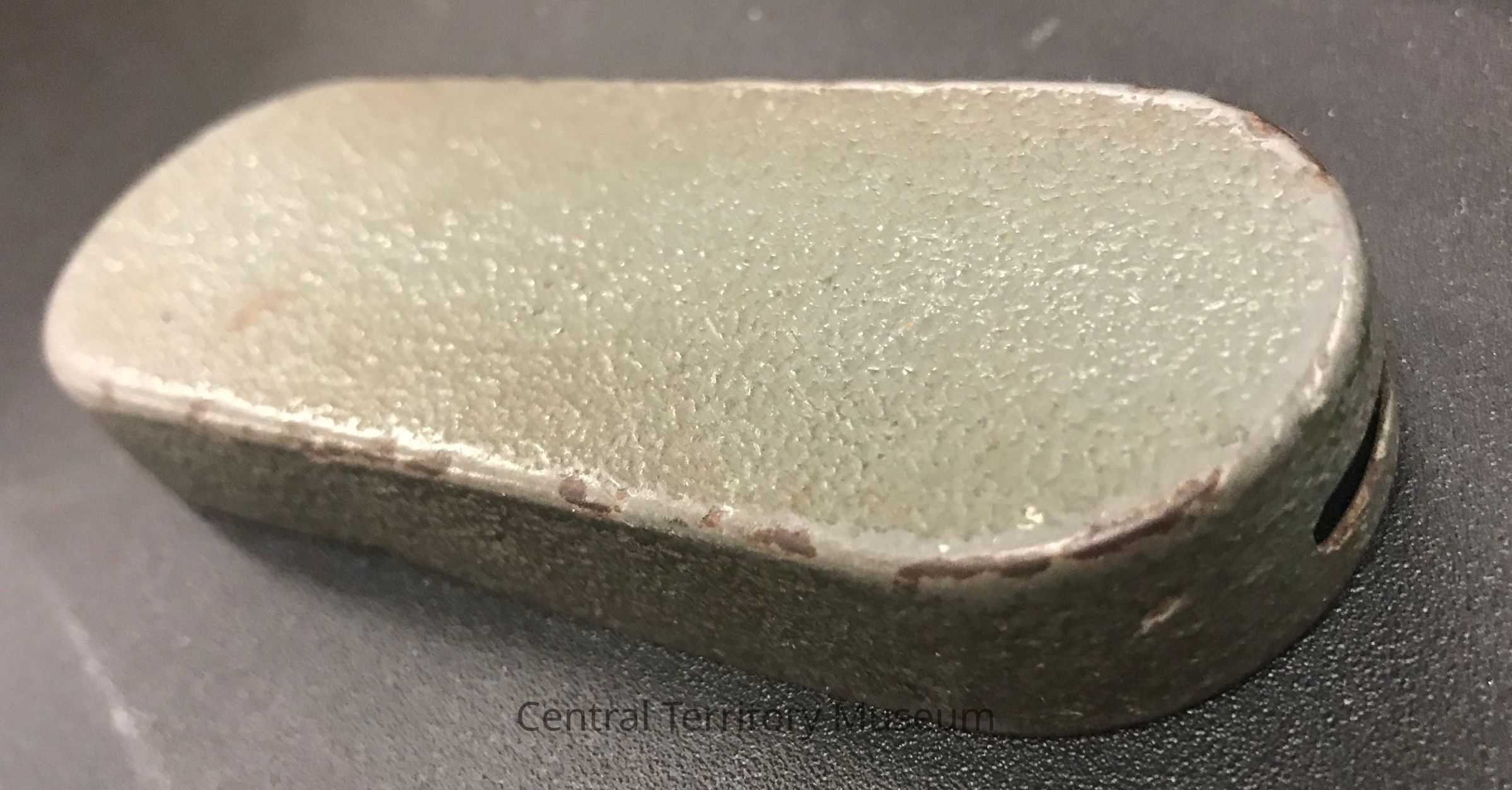 b) Cap for binoculars, grey metal ovular cap, made to cover the eyepiece