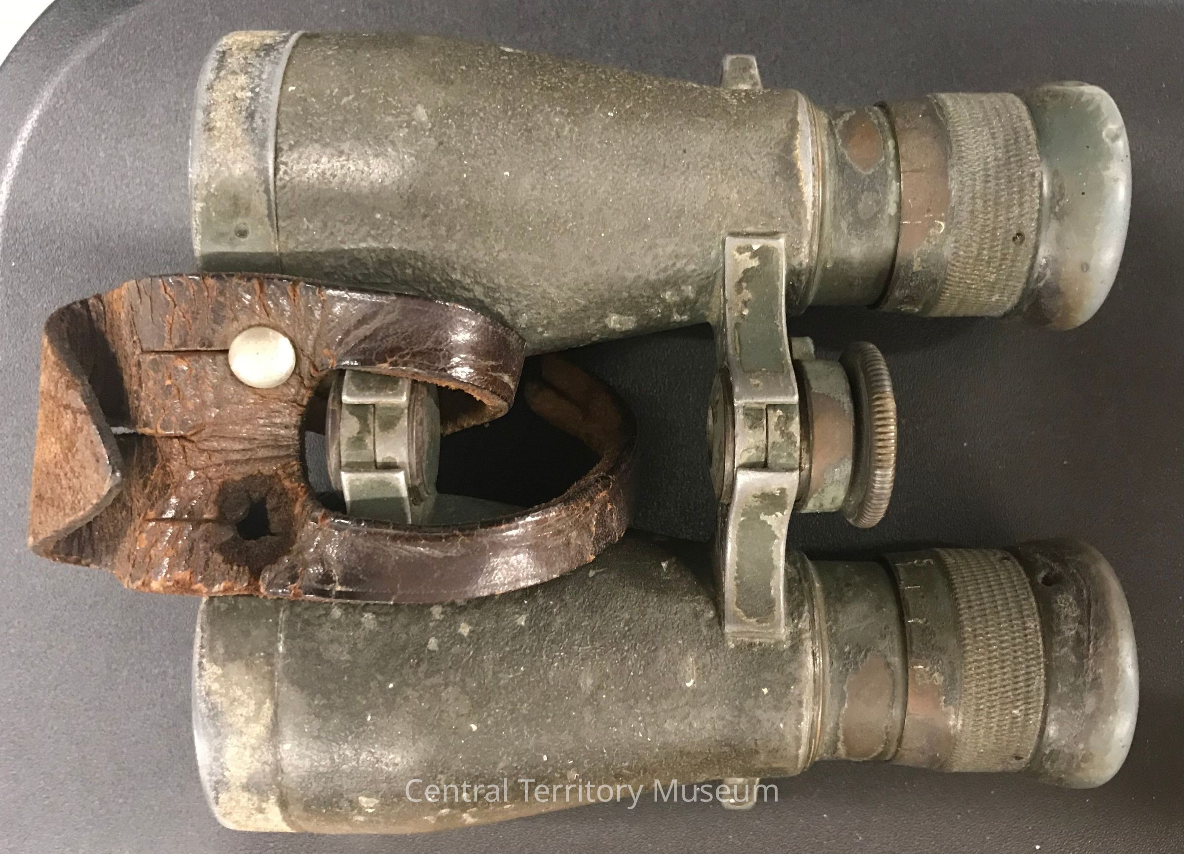 a) Binoculars, grey metal with brown leather strap