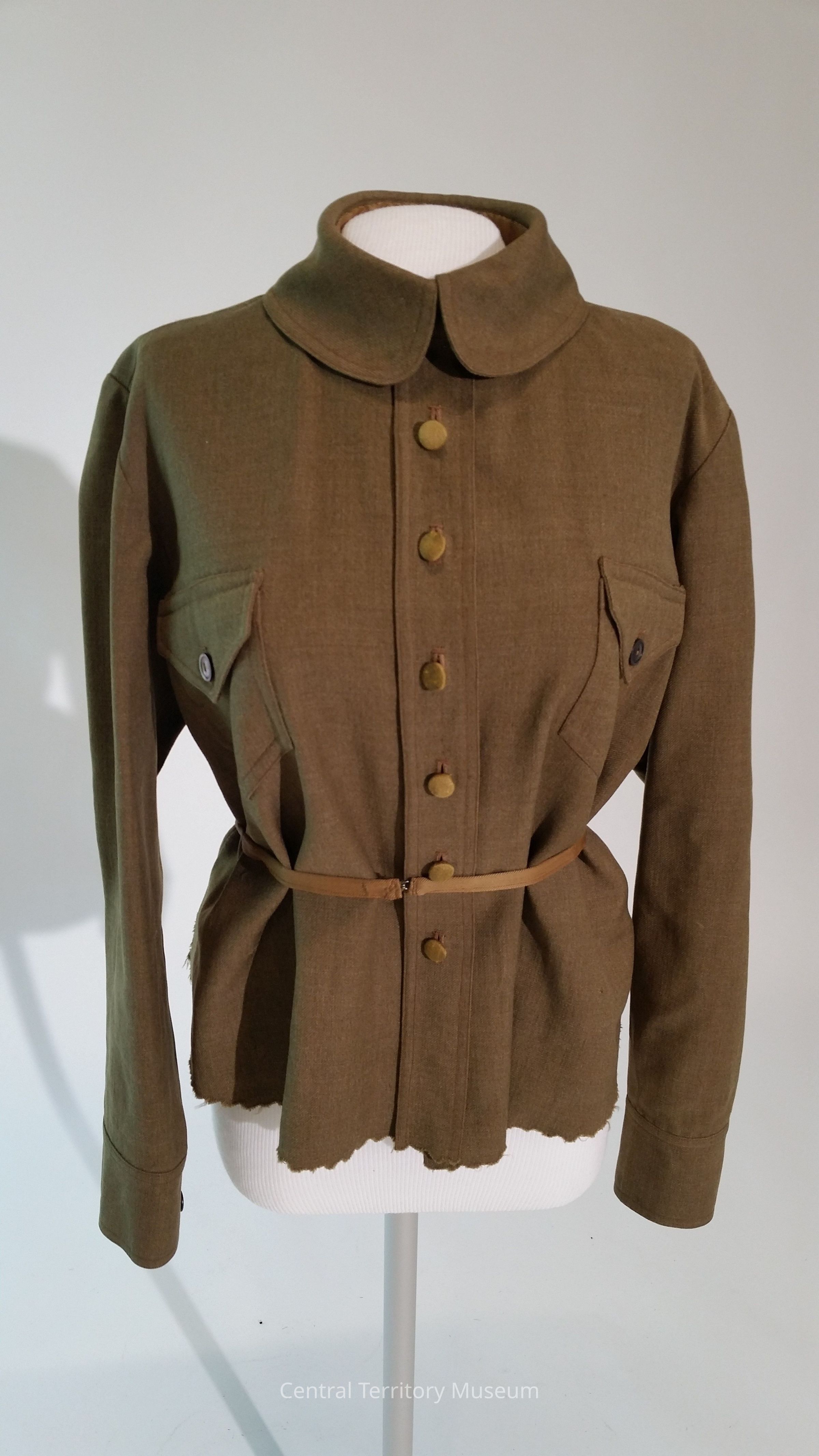 Olive drab green wool woman's blouse with fold over collar with rounded front edges. Blouse closes center front with buttons and three hook and thread eyes at neck. The hooks are no longer attached to the blouse. Collar neck band is lined with a silky brown twill fabric. Blouse has two chest pockets with pointed flap closures that are fastened with buttons. Long sleeves end with a wrist band that closes with two buttons. A narrow belt made of silky feeling brown twill fabric is sewn to the back of the blouse, and the body of the shirt is slightly gathered where the belt is sewn down. The belt fastens center front with one hook and eye. All seams, except for the armseye, are pinked with a large scalloped edge.