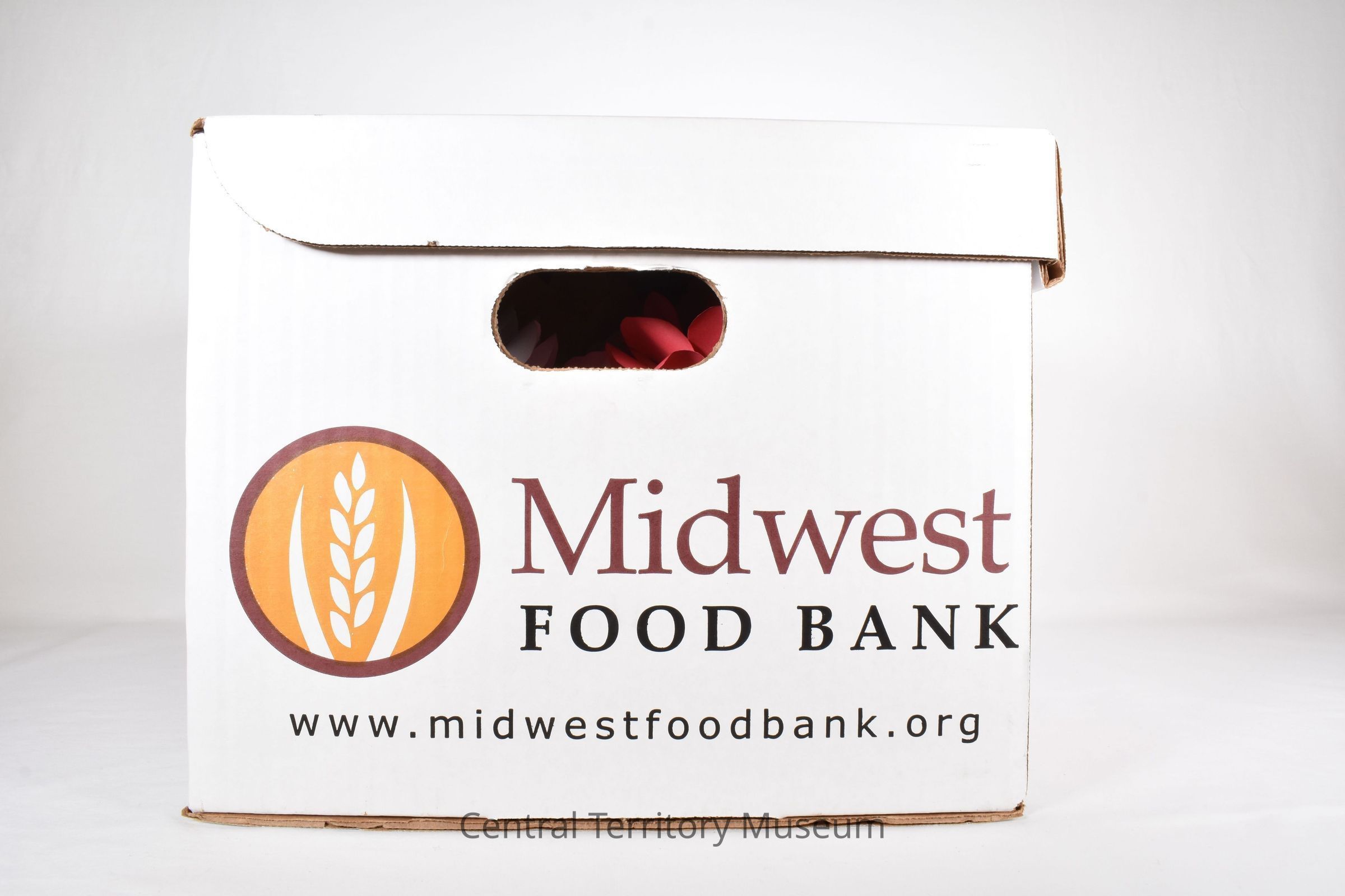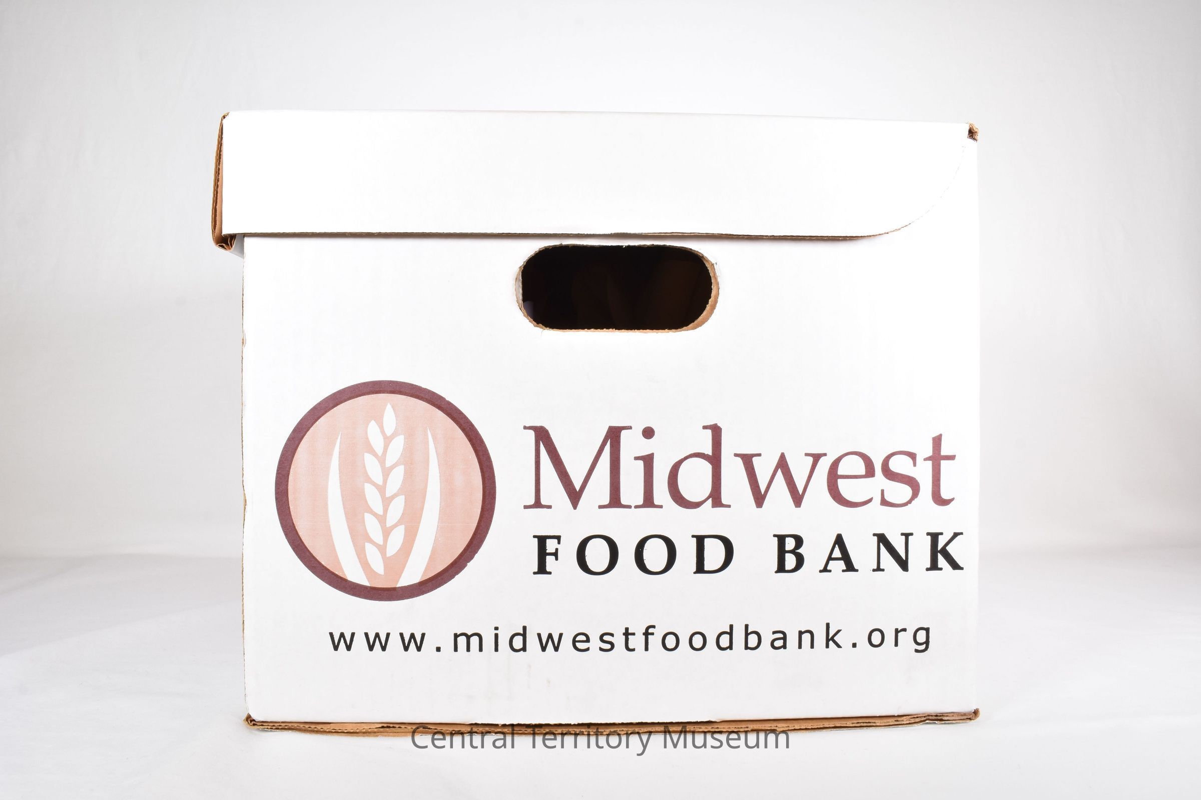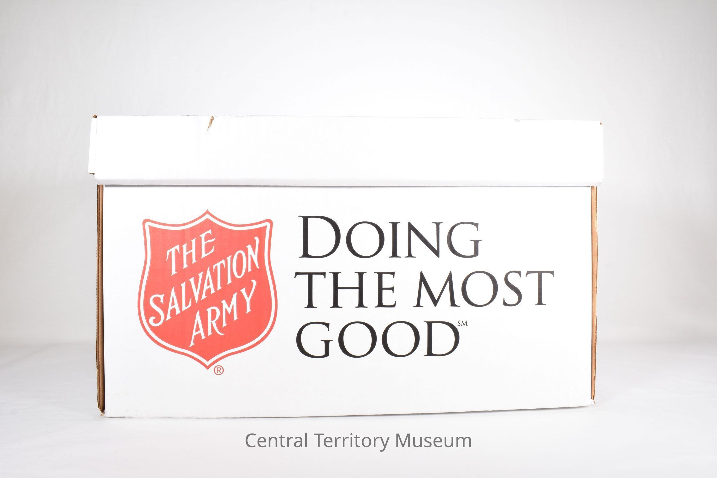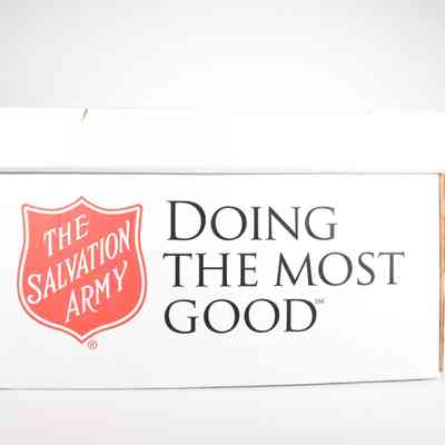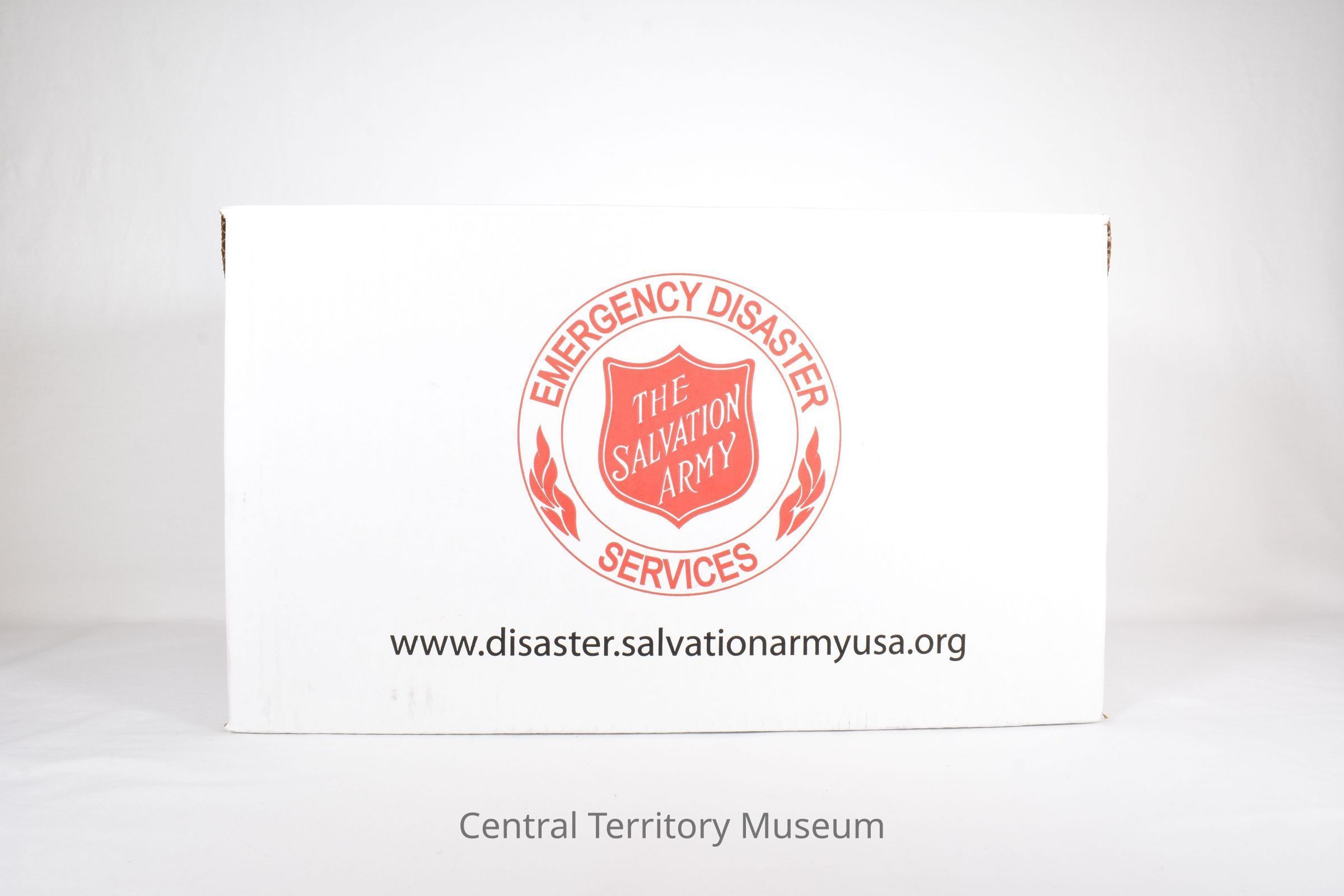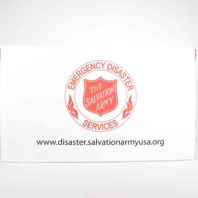 A white Salvation Army Emergency Disaster Services and Red Shield logo branded clamshell cardboard box that features the words Text printed on box includes The Salvation Army USA's website www.disastersalvationarmy.org on the back, "The Midwest Food Bank www.midwestfoodbank.org", on the two sides, and The Salvation Army Red Shield logo with the current brand promise "Doing the Most Good" on front.Acquisition
