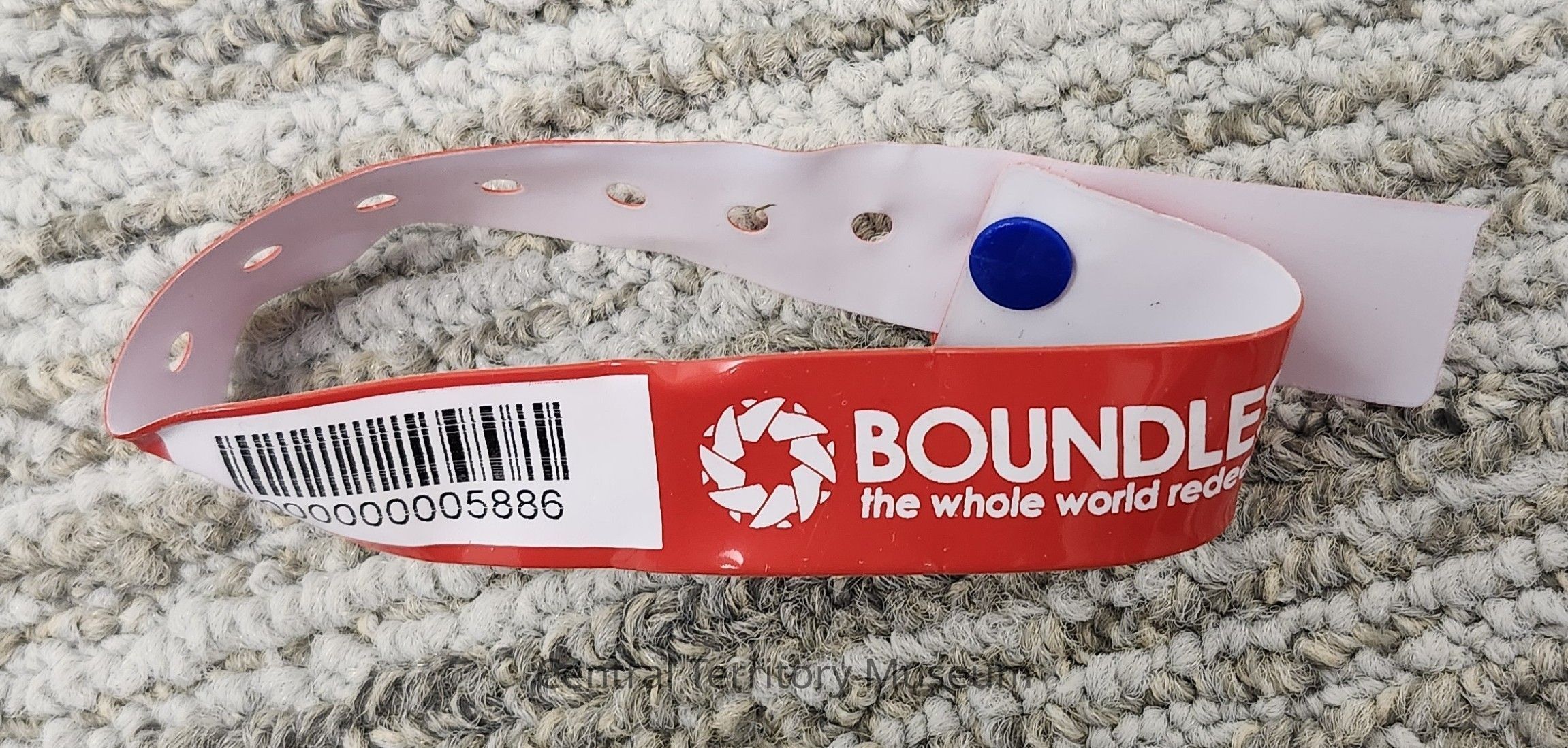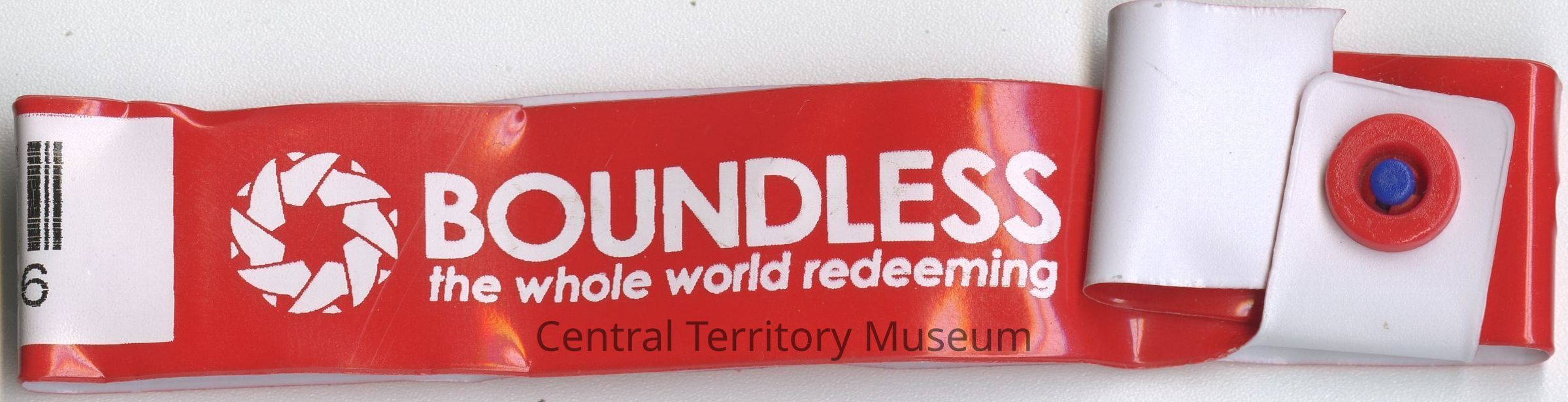 Red and white wristband. The wristband was used by the donor, Joe Caddy, for the 2015 Boundless Salvation International Congress in London, UK.