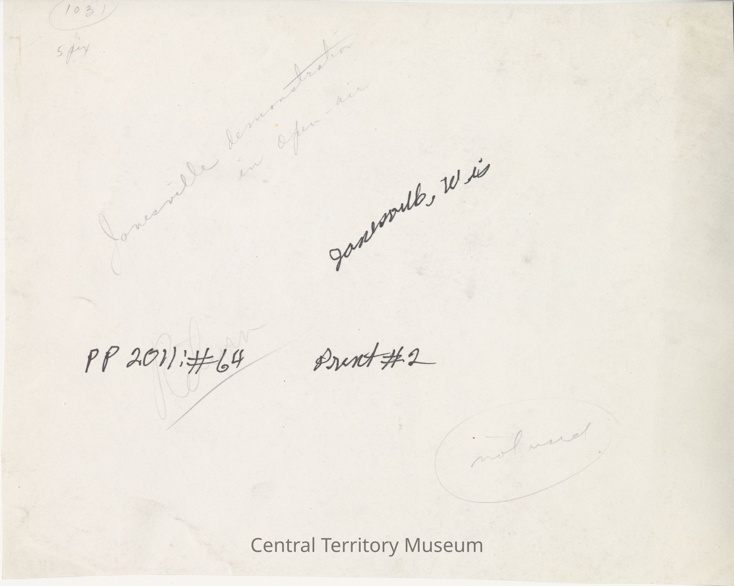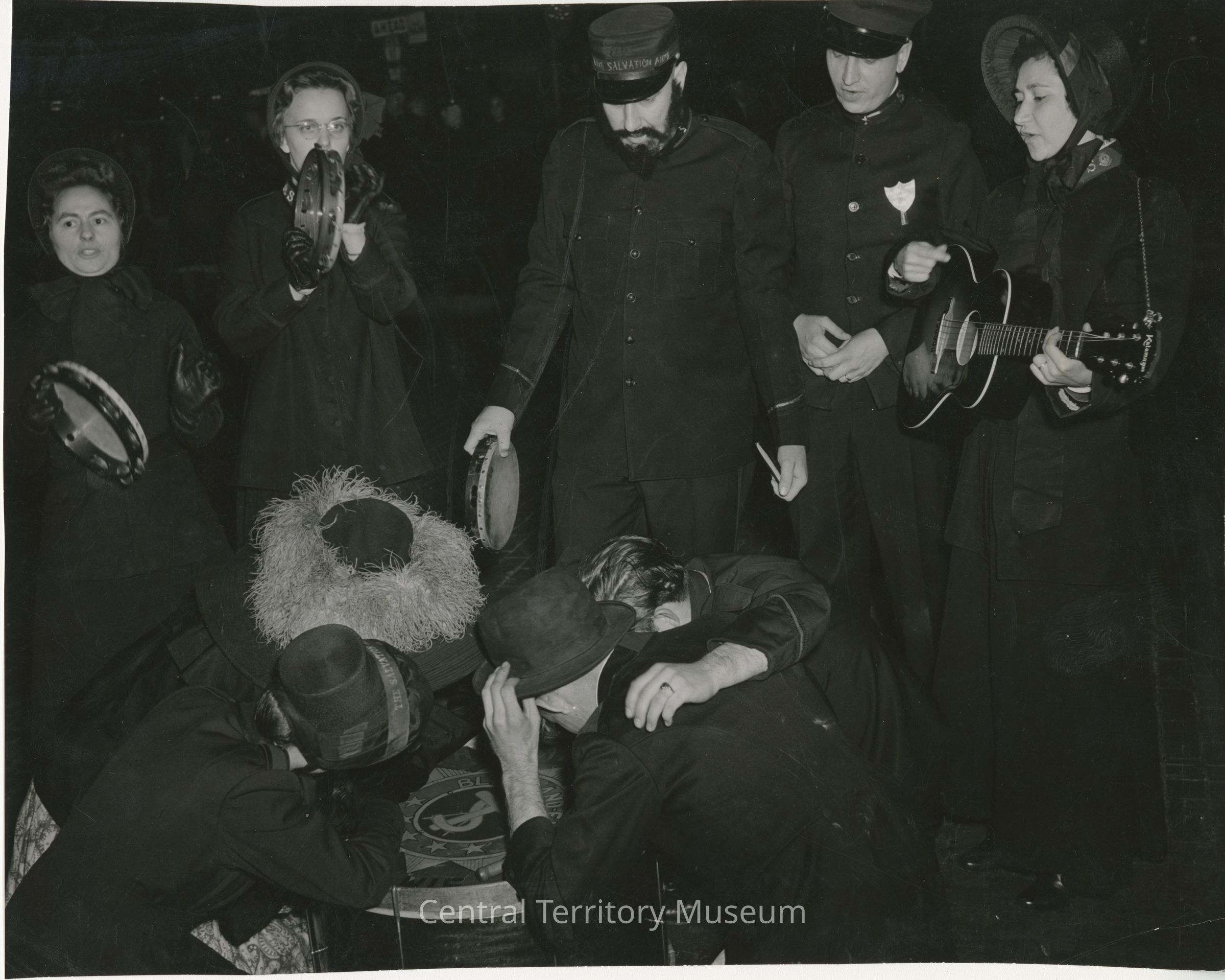 Black and white photograph showing a group of men and women dressed in vintage Salvation Army uniforms performing an outdoor skit of an Open Air meeting.