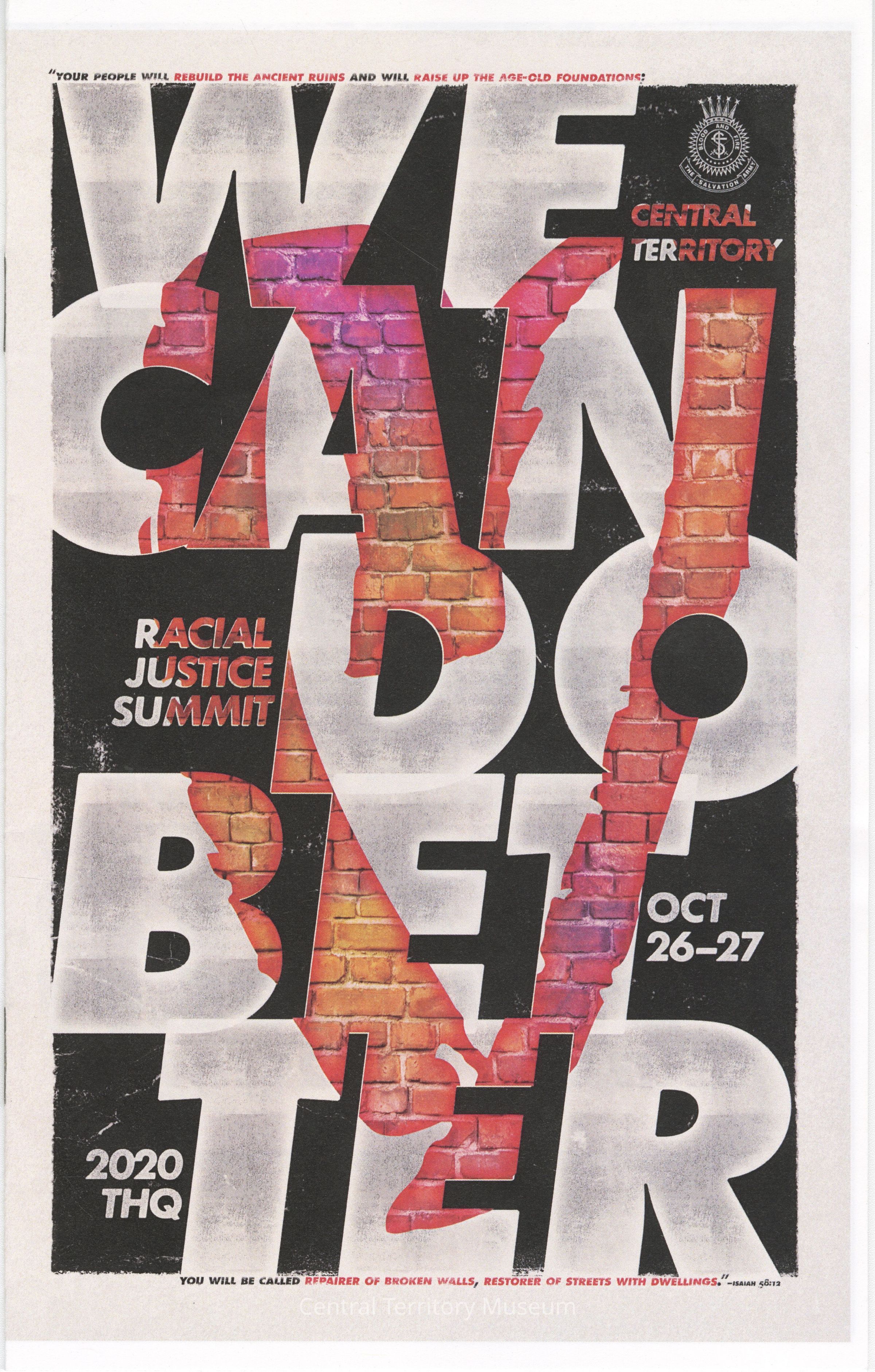 Program for the Racial Justice Summit which took place October 26th to 27th, 2020. The title of the summit was "We Can Do Better." The summit was hosted at The Salvation Army Central Territory Headquarters. 5.5 in x 8.5 in.Acquisition
