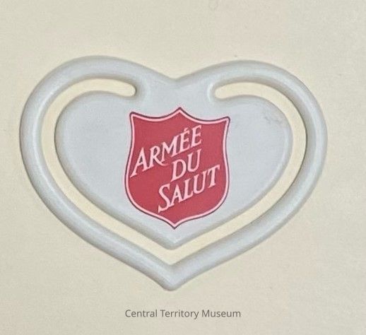 Heart shaped white plastic paper clip or bookmark. A Red Shield logo is printed in the center with Armee du Salut printed in white on it. The donor brought this back to the Central Territory from the International College for Officer Training in 1987.