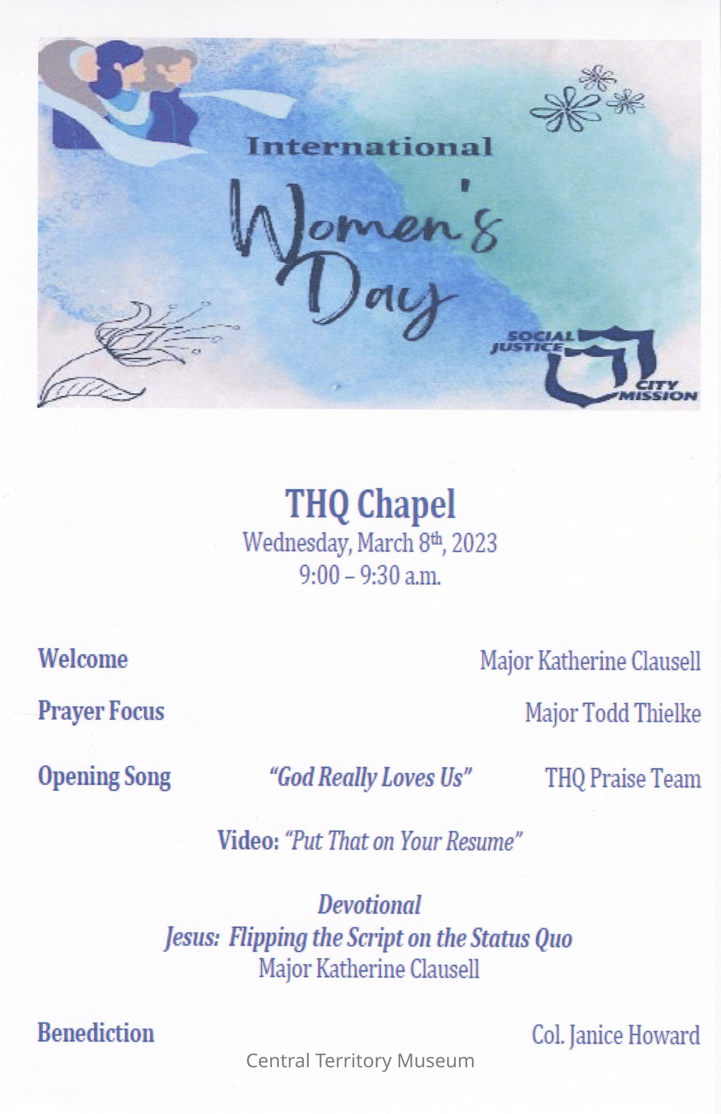 Program by the Social Justice & City Mission Department for the THQ Chapel service on International Women's Day. The chapel service was held at the Central Territory Headquarters Chapel on Wednesday, March 8th, 2023. At the top is a blue and green image with a graphic of women in the top left and the Social Justice & City Mission logo on the bottom right. The people involved with the chapel service was Major Katherine Clausell, Major Todd Theilke, Colonel Janice Howard, and the THQ Praise Team.Acquisition