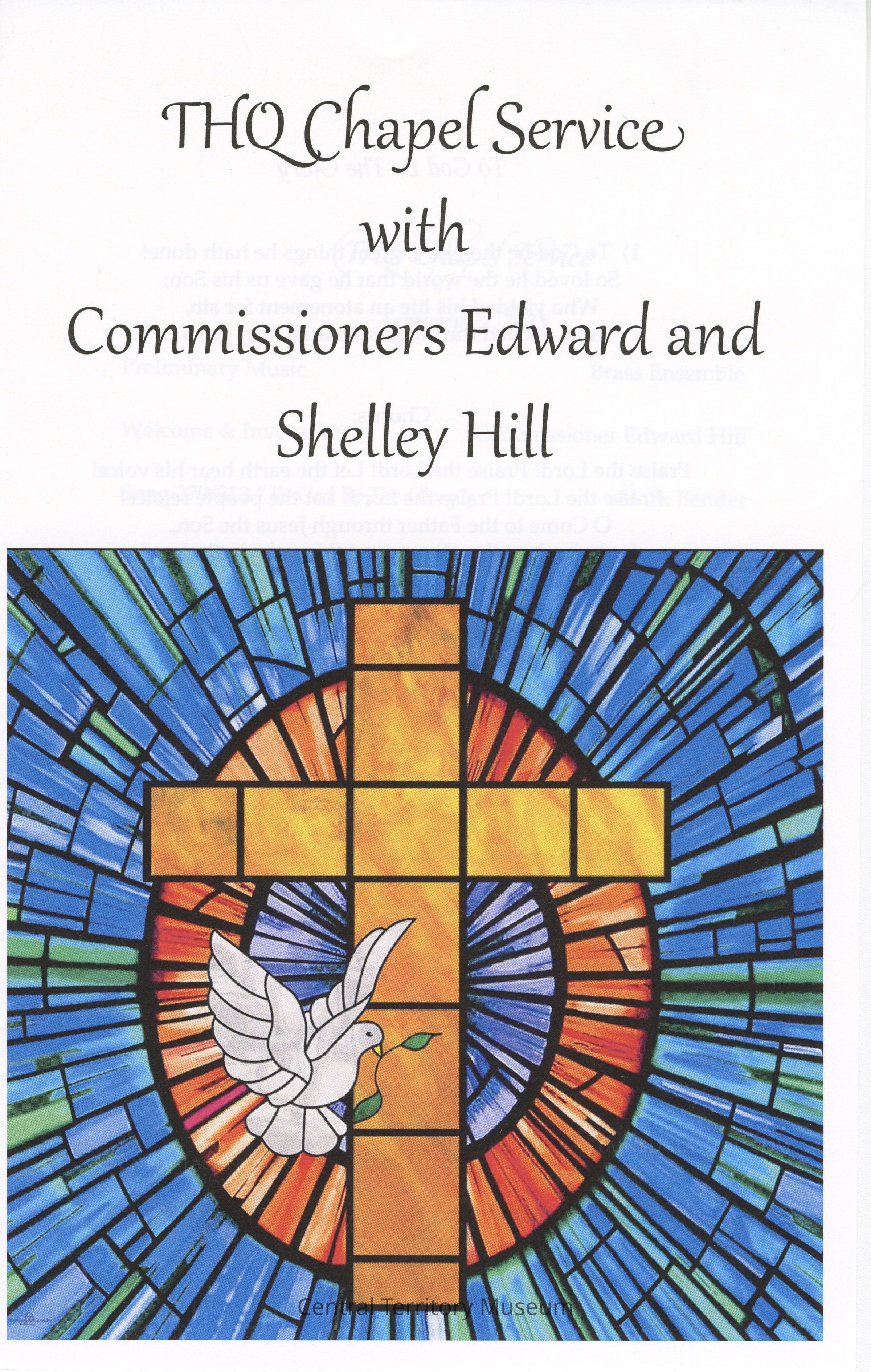 Program for the THQ Chapel Service on February 22nd, 2023. The service was held by Commissioners Edward and Shelly Hill. The music was done by Mark Bender and Courtney Smith. The benediction was done by Colonel Janice Howard. The cover of the program has a image of a stain glass window of a cross and a dove. The back has a Red Shield logo.Acquisition