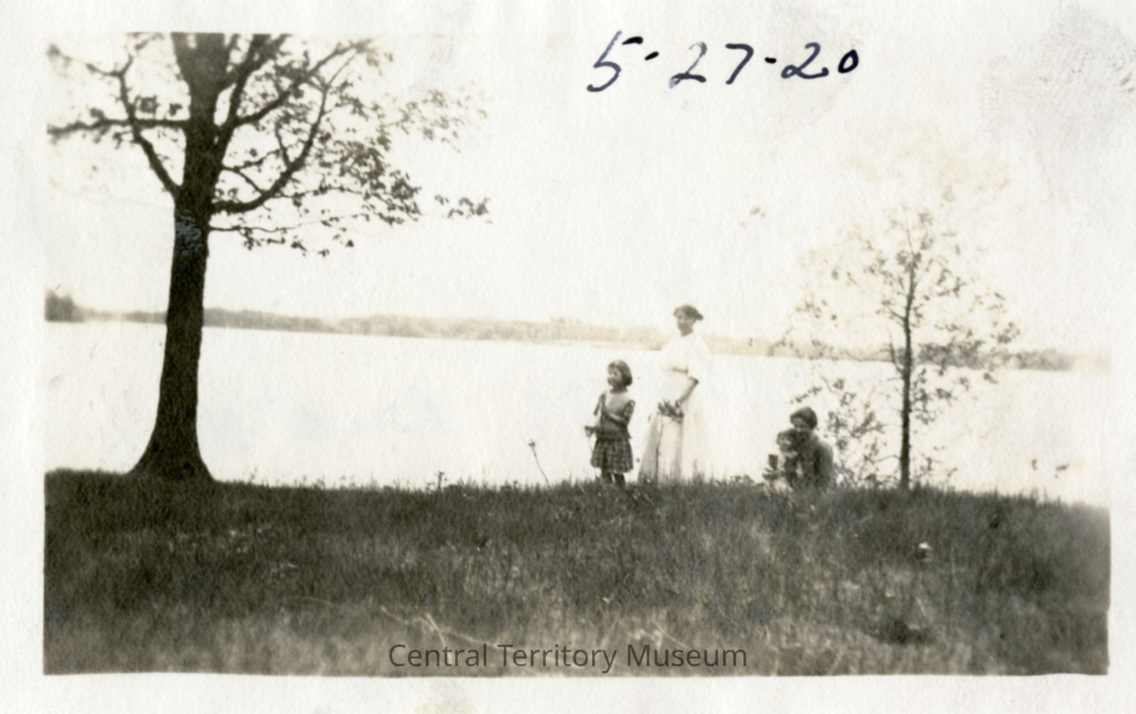 Photo of two women and two girls near the lake at Skogsbo Camp in Long Lake, Illinois. The date, 5-27-20, is written across the top.