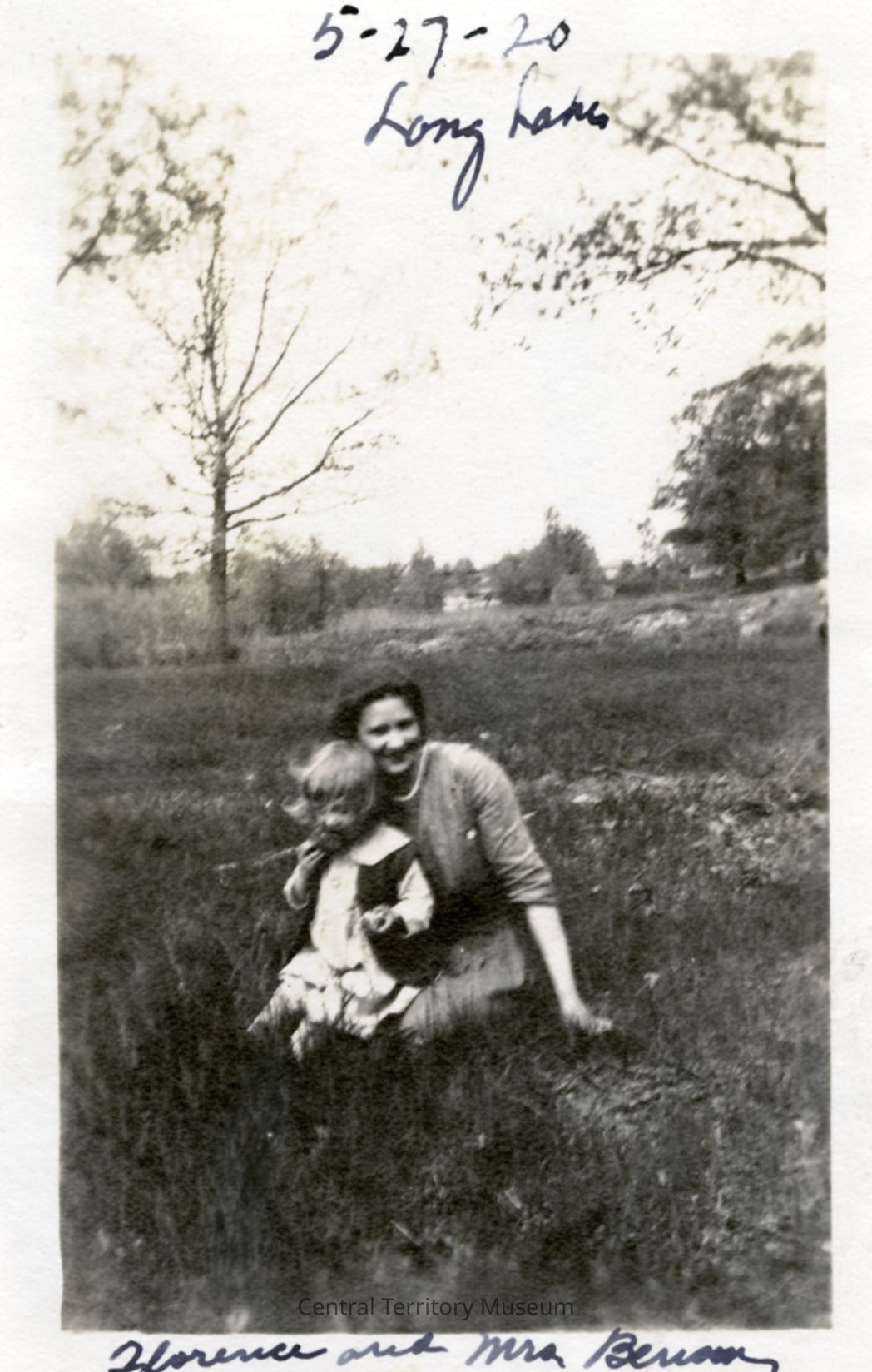 Photo of a woman and a girl, seated on the grass in a field. Trees can be seen in the background. The date and location, 5-27-20 Long Lake, are handwritten near the top edge and the names "Florence and Mrs. Benson" are written along the bottom edge.