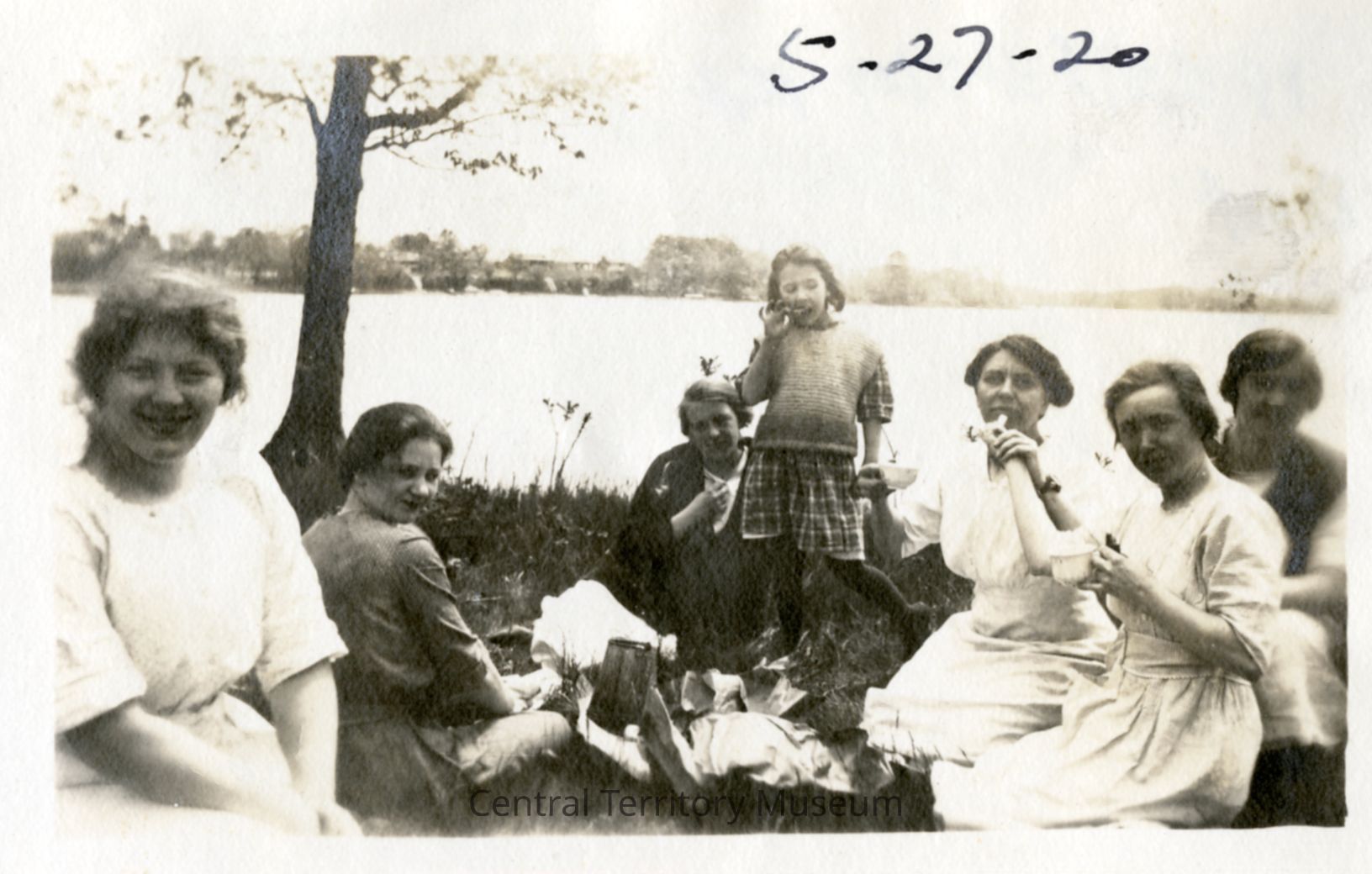 Photo of women and girls enjoying a picnic by Long Lake at Skogsbo Camp.