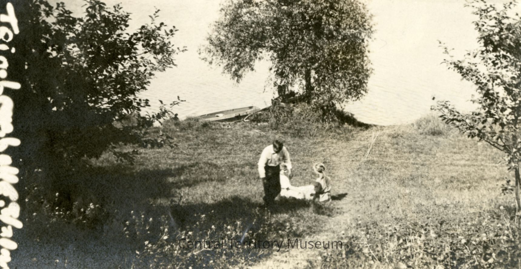 Photo of a man, a woman, and a girl near the edge of Long Lake at Skogsbo Camp. A rowboat can be seen floating nearby on the left.