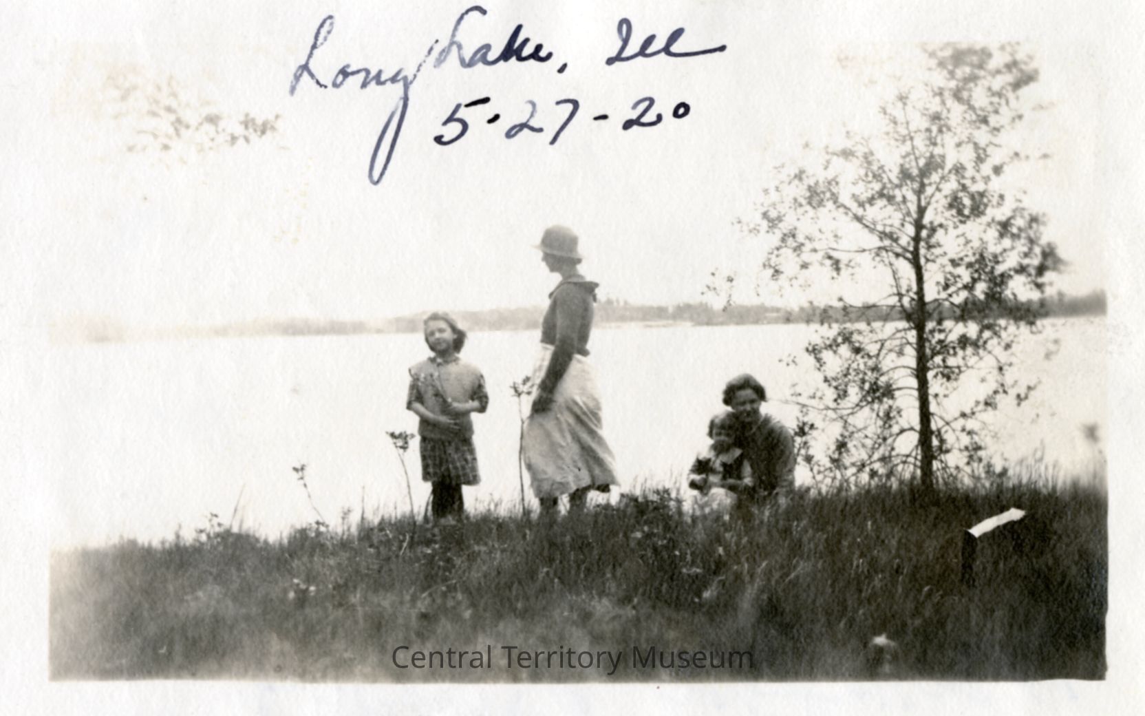 Photo of two women and two girls, seated and standing near the shore of Long Lake at Skogsbo Camp. The date and location, 5-27-20 Long Lake, are handwritten near the top edge.