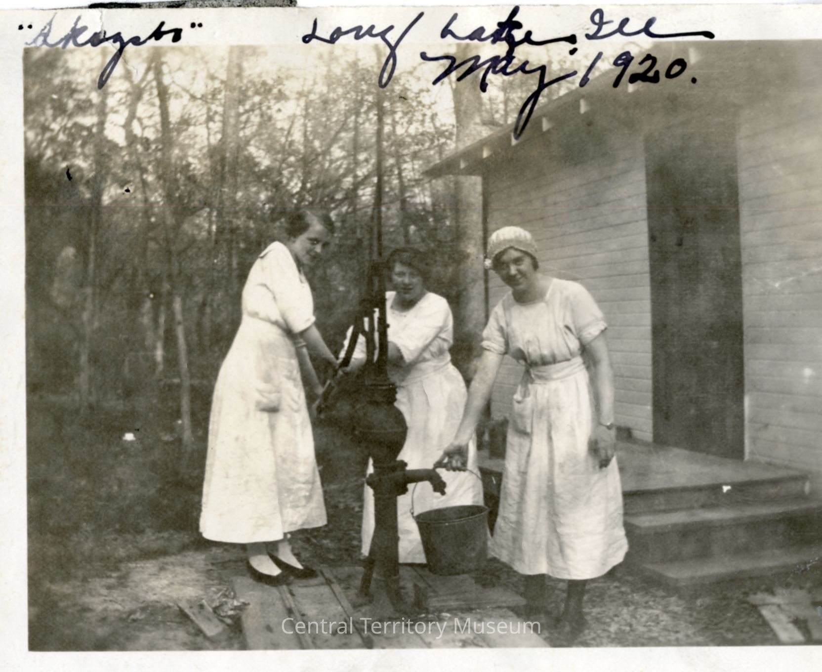 Photo of three women at a pump outside of a cabin at Skogsbo Camp. Two women are pumping and one woman is holding a bucket. The name "Skogsbo, the location "Long Lake, ILL" and the date May 1920 are handwritten near the top edge.