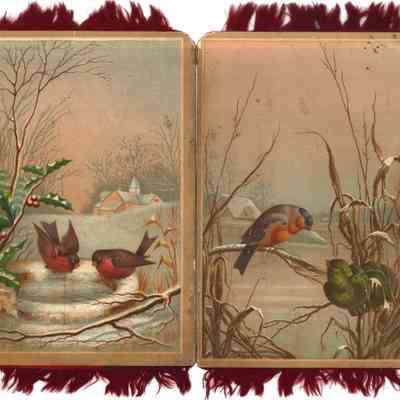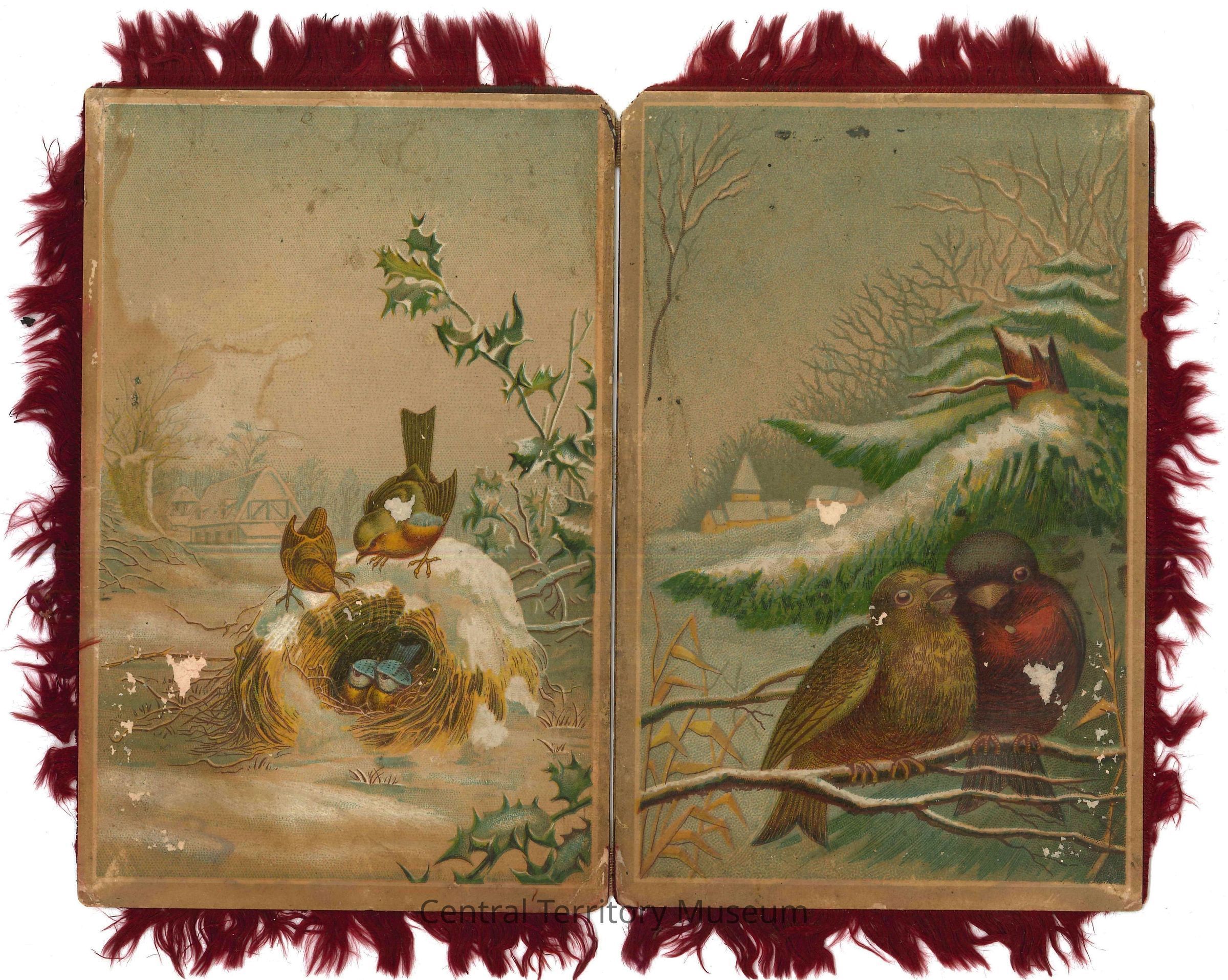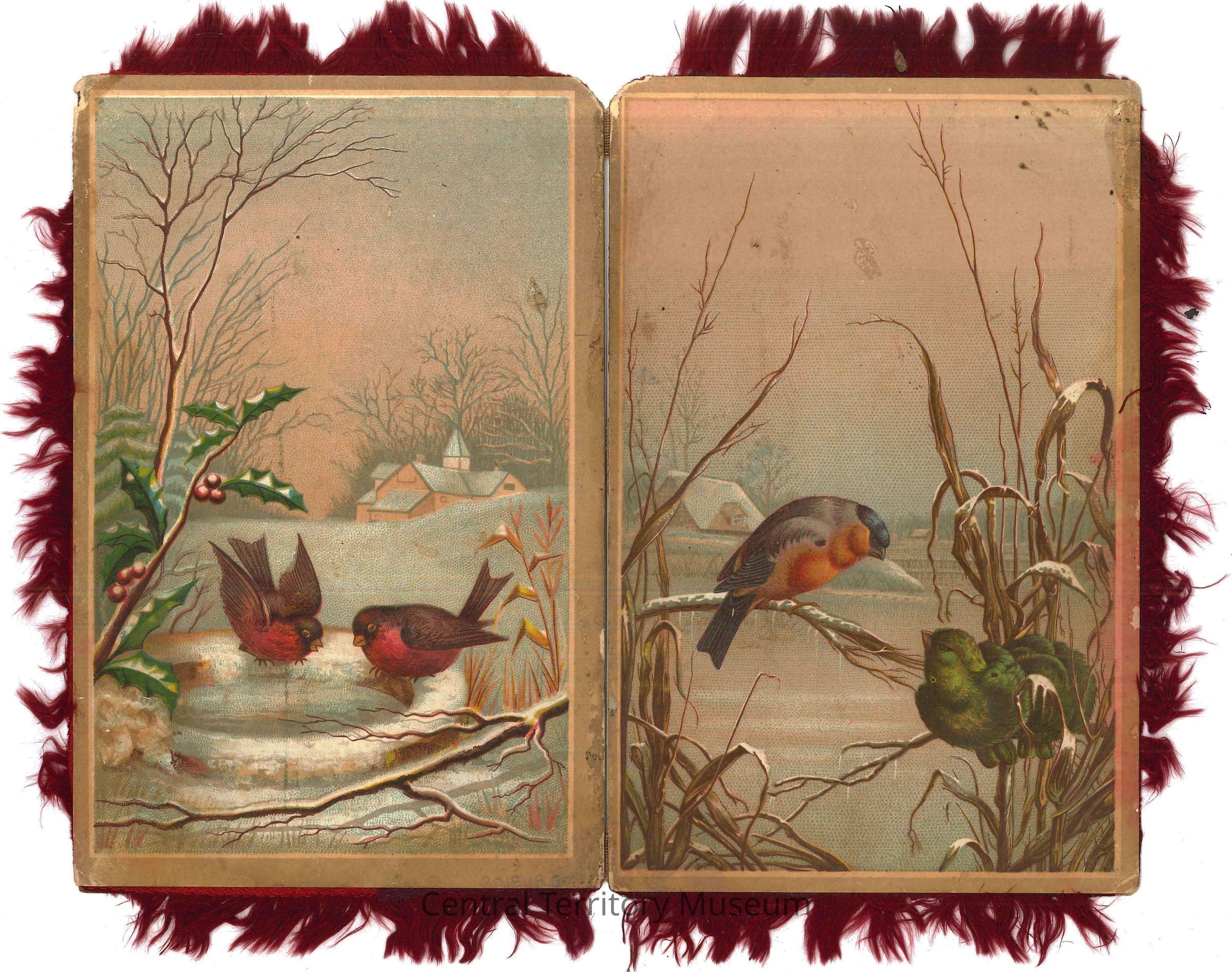 Card with red fringe (silk?) featuring depictions of birds. The card consists of two pieces of cardstock paper attached to each other vertically, so that the card opens and closes. There are pictures on both the front and back of the cardstock pieces, so there are four picture panels total. The colored pictures appear to be prints and all include two birds in nature during wintertime, with one building (home/church) in the background. There is no printed or written text on the card.