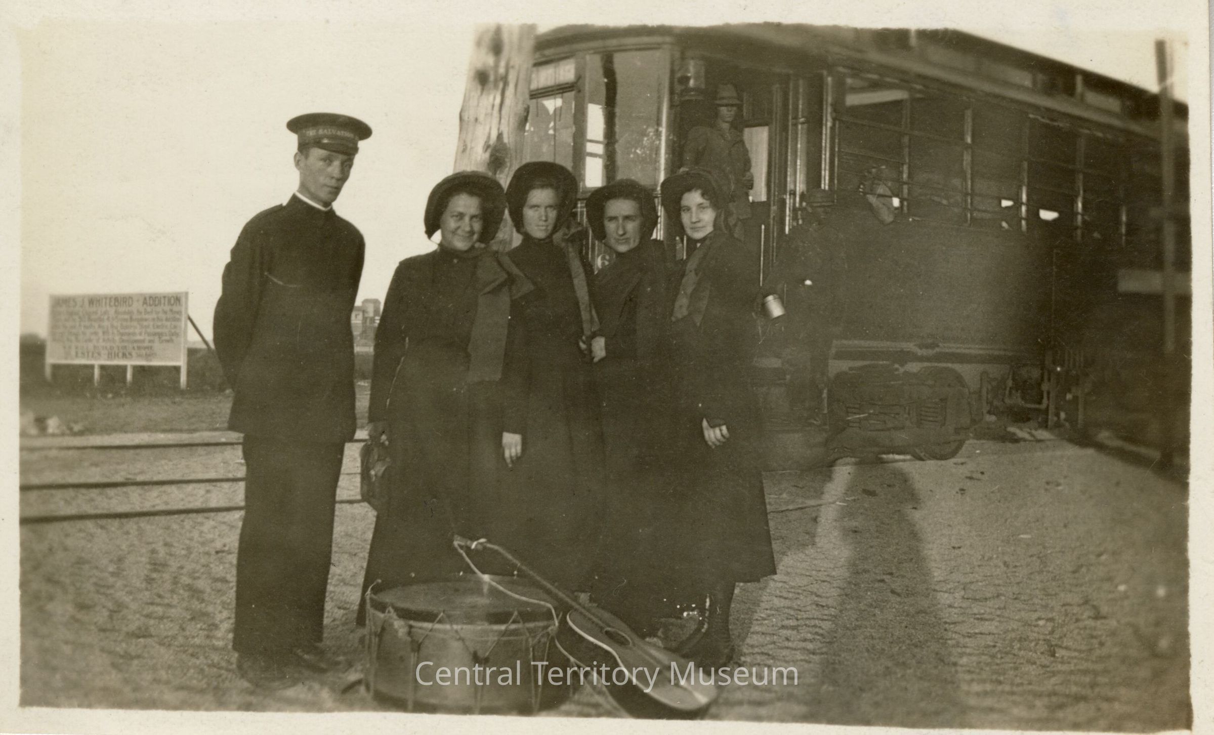 Black & white photo, 2.5" x 4.25", of a group of Salvationists standing near a train. A drum and a guitar are on the ground in front of them. Two men can be seen standing on the train. A large sign in the background advertises homes in the James J. Whitebird Addition, sold by Estes-Hicks which potentially places the photo as being taken in Picher, Oklahoma.