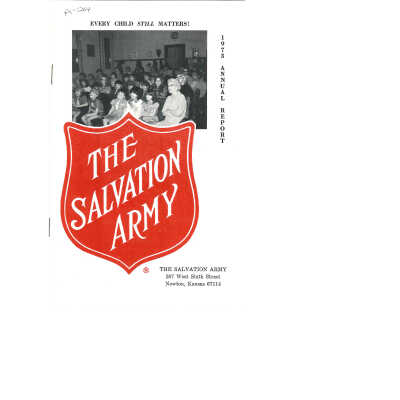 Annual report for Newton, KS corps, 1973. The cover, printed on glossy paper, has a large Red Shield and a black & white photo of a childrens meeting. The title and year are printed in black vertically next to the photo. The corps address is printed in the lower right corner. Page 2 has a black & white photo of the corps building. The years of service to Newton and the surrounding area are printed below. Page 3 has a letter from John P. Dickey, the Advisory Board Chairman., printed on his business (Dickey Music Co) letterhead. Page 4 has a letter from Lt. James A. Birney, corps officer and page 5 contains the income and expense report. Pages 6 and 7 details the statitistics of service to others and the Christmas report. A black and white photo of corps service in action is printed on page 7. Pages 8 and 9 have a montage of photos showing service to children and upcoming programs. Page 10 lists the Advisory Board members and acknowledges volunteer service. Page 11 has The Salvation Army mission statement and requests consideration when estate planning. The back cover has a verse, written by William Pearson and printed in The Salvation Army Song Book No 789, and a Red Shield logo.