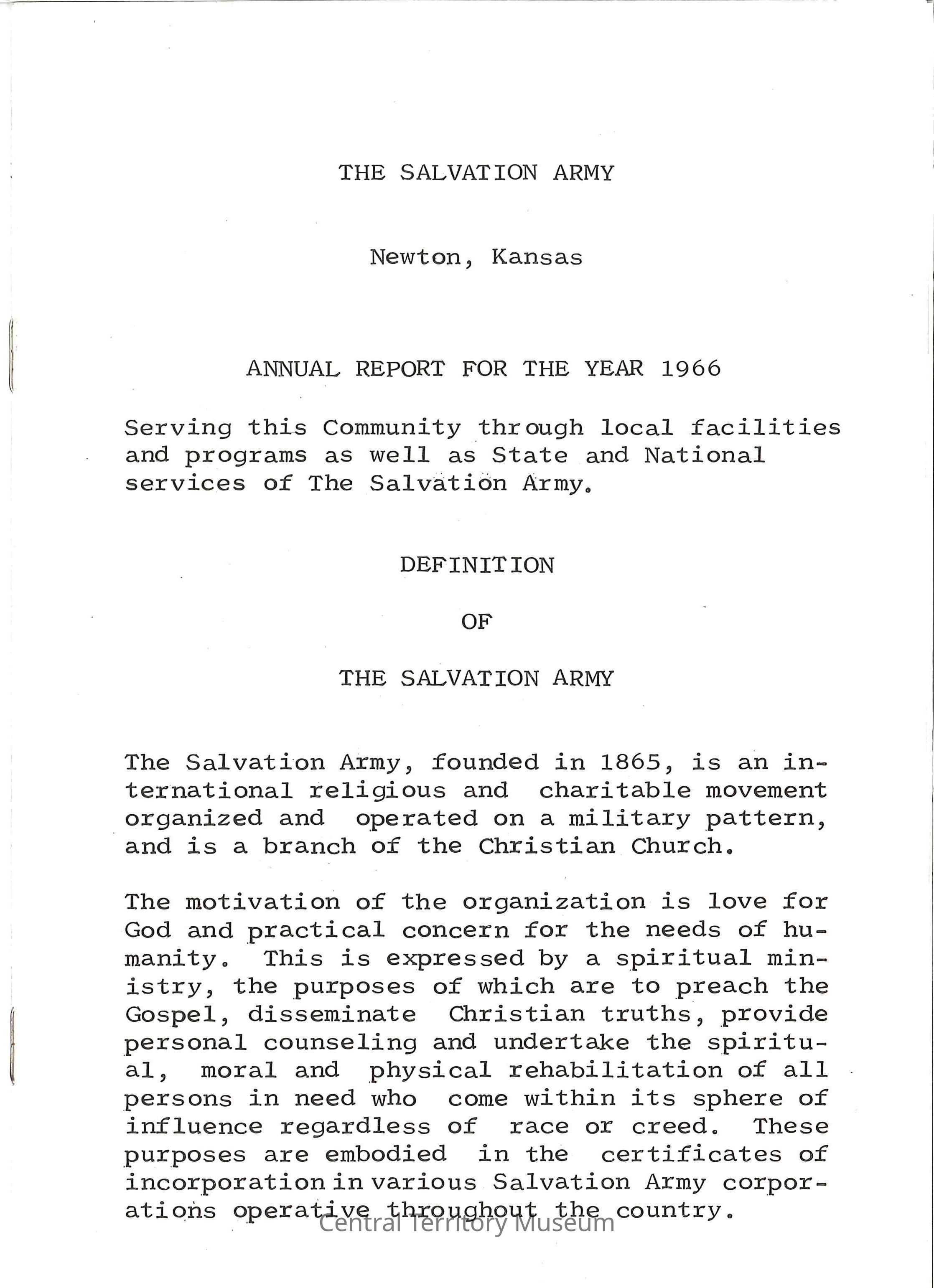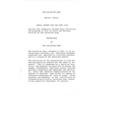 Annual report for the Newton, KS corps. The cover has the title, year, and definition of The Salvation Army printed in black on white paper.