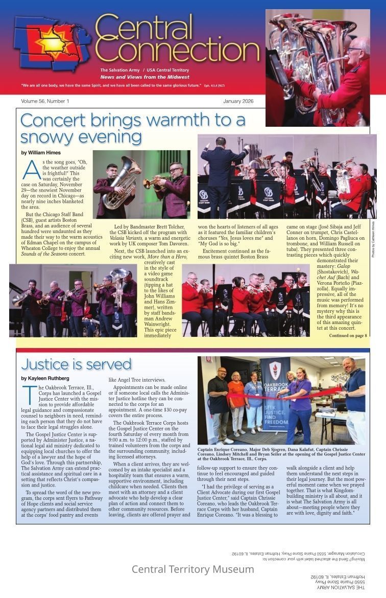 The Central Connection is a monthly periodical published by The Salvation Army USA Central Territory. The January 2026 edition of Central Connection is published by The Salvation Army USA Central Territory and highlights ministry updates, human‑interest stories, musical events, leadership development, corps initiatives, and memorial notices. Key themes include: “Sounds of the Seasons” Concert - A detailed review of the Chicago Staff Band’s annual Sounds of the Season concert featuring Boston Brass, new musical works, and traditional pieces. Gospel Justice Center Launch at the Oakbrook Terrace, IL Corps. This is a new legal‑aid ministry providing affordable legal guidance to those in need, run in partnership with Administer Justice. Pet Blessing Service at the Kansas City (Citadel), KS Corps - A recap of the corps’ first pet blessing service focusing on community outreach and pastoral care. Youth Arts Advisory Board Formation (YAAB) - Overview of a new youth leadership structure within territorial music and creative arts ministries. Calling Story from Lt. Melissa Christiansen - Reflection on how camp ministry shaped her calling and led to her current youth leadership role. Majors Mauricio & Melisa Gutierrez ministry profile. Their journey from Argentina to Chicago (La Villita), IL Corps, including music and dance programs and community ministry. Spotlight on Jackie Fulcher a soldier at the Battle Creek, MI Corps. She is the recipient of the Territorial Award of Excellence for Spiritual Life for decades of service. International College for Officers (ICO) testimony - Captain Josh Polanco shares his formation experience at ICO and the vision God gave him for future ministry. Mustard Seeds Farewell - Tribute to cartoonist Bob Swanson, who created more than 300 Salvation Army-themed cartoons since 1997. January prayer emphasis: “Pray Beyond Yourself.” Practical spiritual encouragement from Lt. Colonel Dan Jennings (“No Fear This Year”). A February prayer calendar listing daily readings and corps/territories to pray for. Promotions to Glory: Major Wilma Velazquez and Lt. Colonel Lois Harvey. List of officers retiring in 2025.