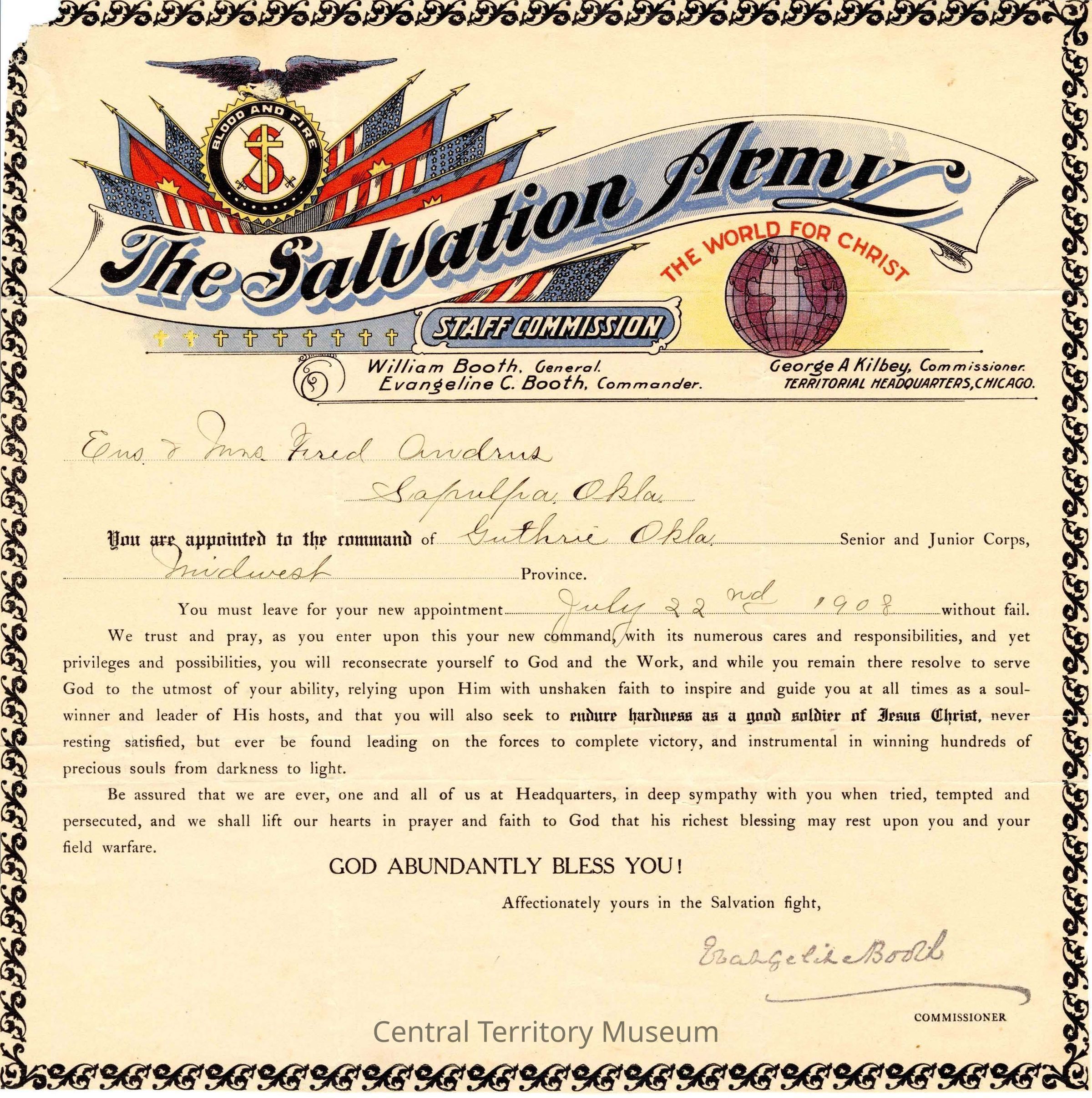 Certificate appointing Ensign & Mrs. Fred Andrus of Sapulpa, OK to the command of the Guthrie, OK Senior and Junior Corps, Midwest Province. They were advised to leave for their new appointment July 22, 1908.