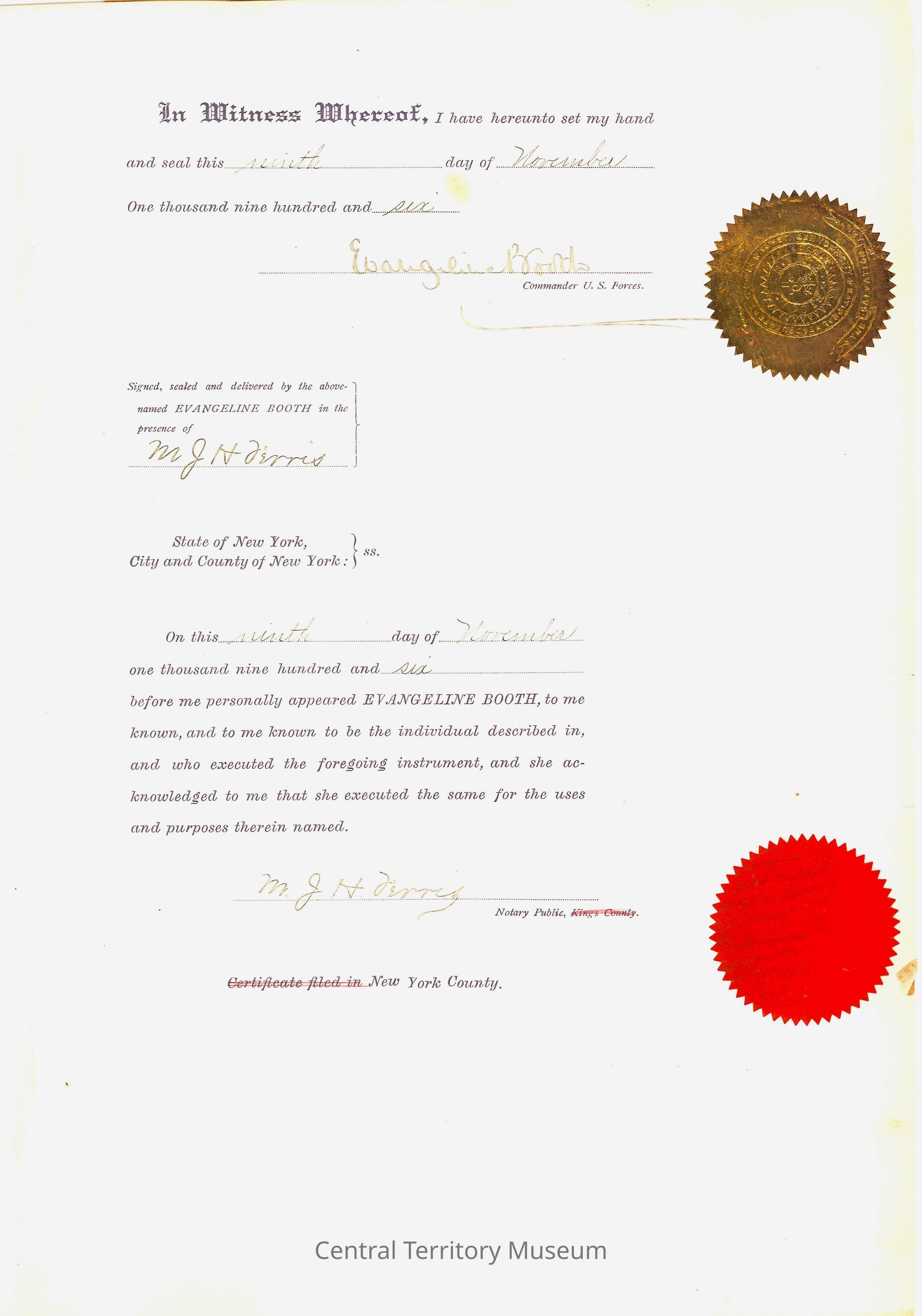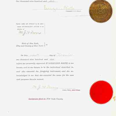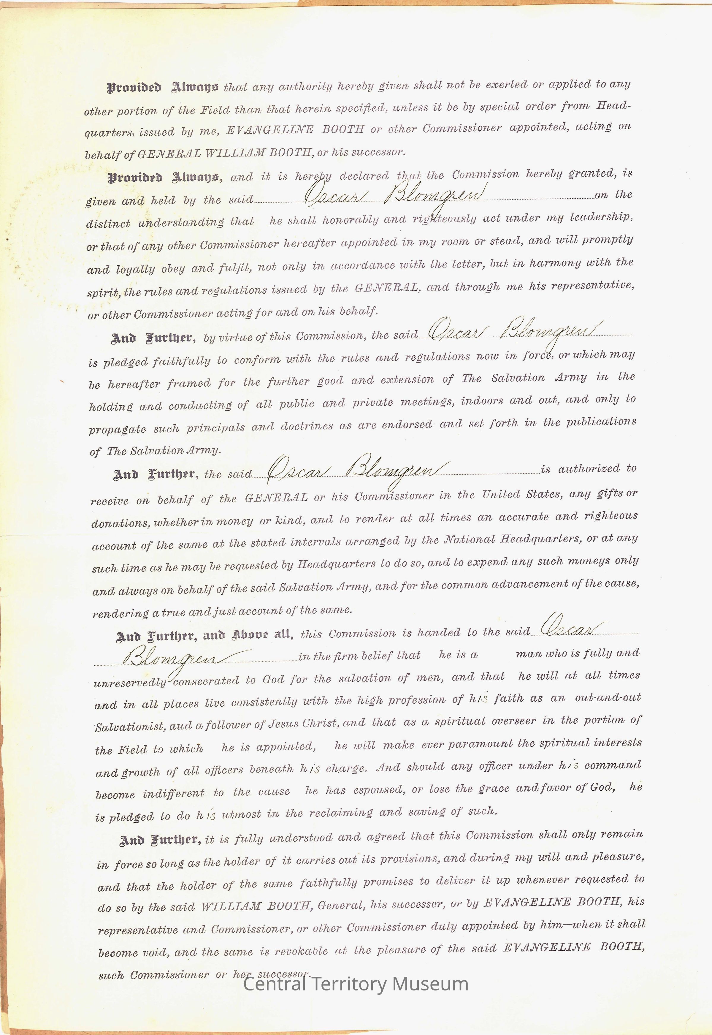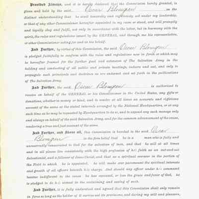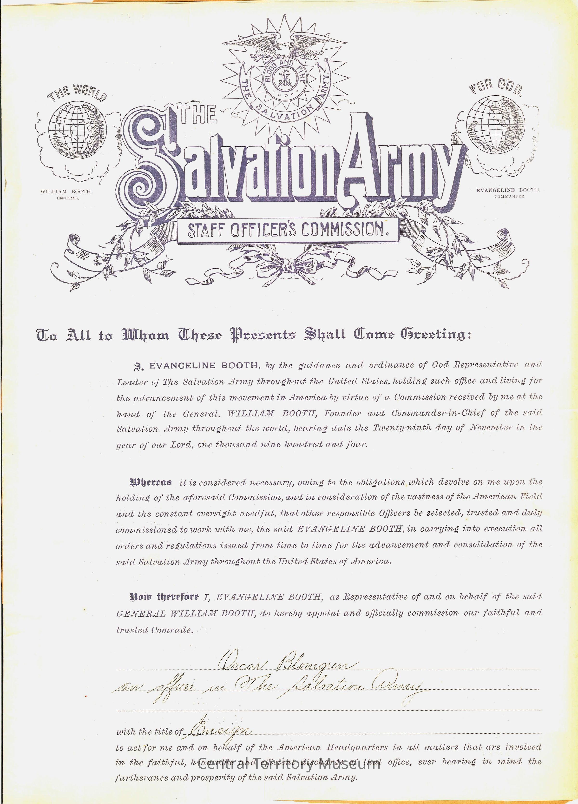 Certificate, Staff Commission, issued to Ensign Oscar Blomgren, appointed by Evangeline Booth to act for her and on behalf of the American Headquarters. The document is signed by Evangeline Booth, and witnessed and notarized by Mr. J.H. Harriis of the State of New York, City & County of New York.Acquisition